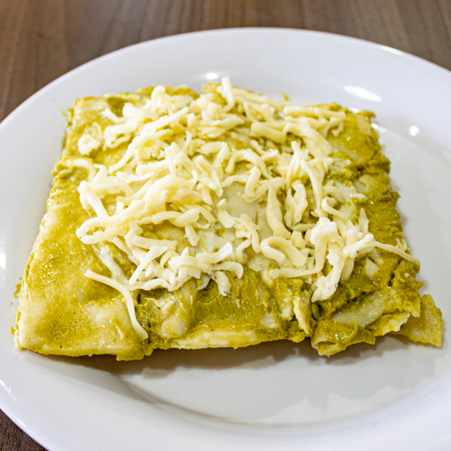 Cuatro tortillas de maíz bañadas en salsa verde, con pollo y con queso rallado