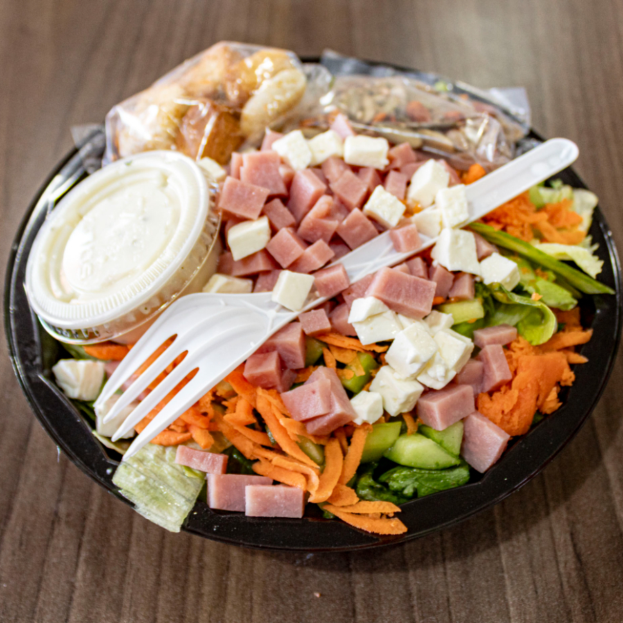 Mezcla de lechugas, pepino, panela, zanahoria, proteína a elegir (pollo o jamón), con aderezos, semillas y crutones.