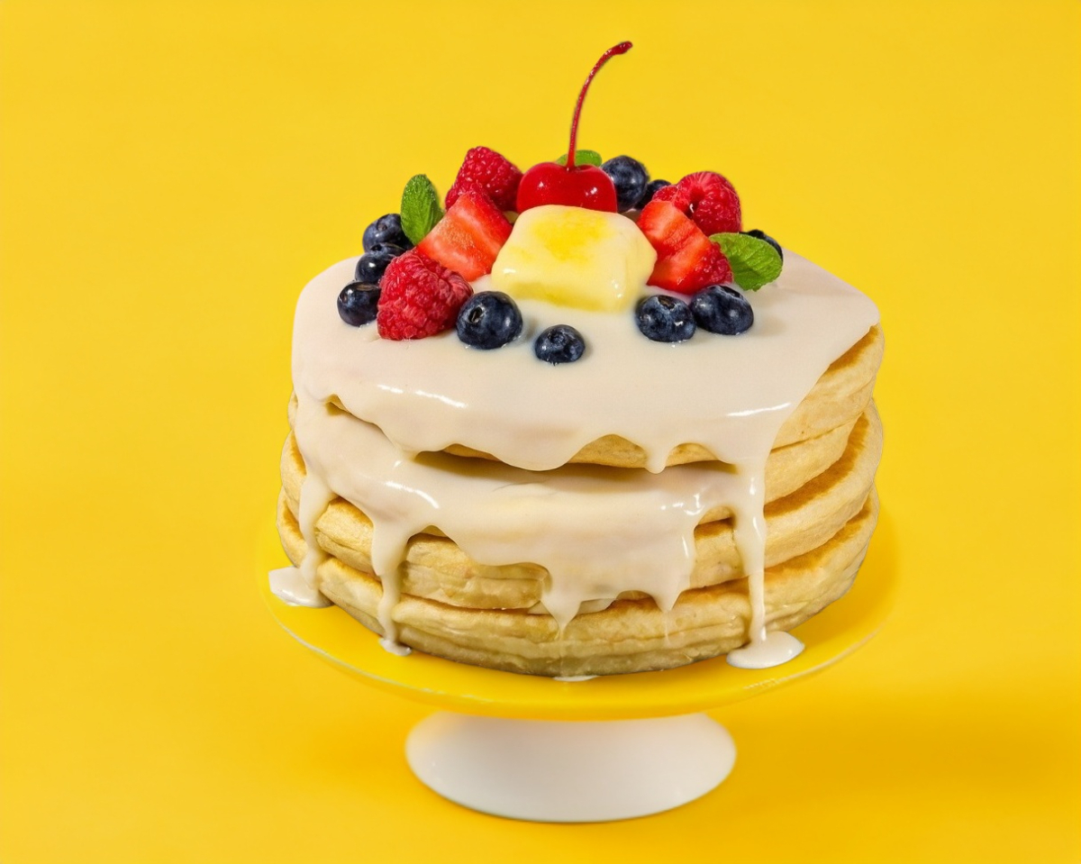 2 piezas de Hotcakes, preparados con Canela, Vainilla, Mantequilla menonita, decorados con fruta fresca bañados en Miel de Maple