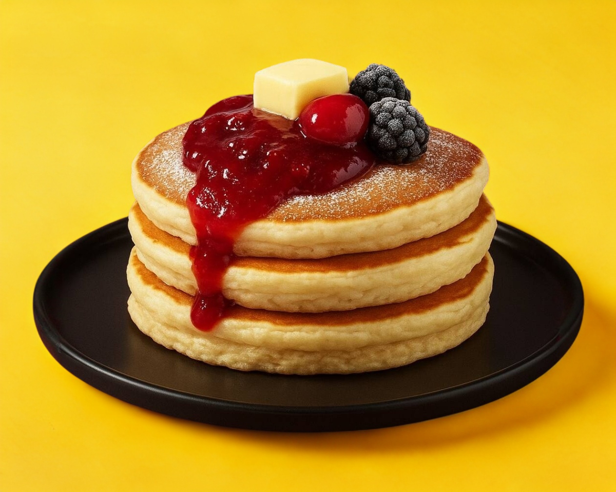 Hotcakes tradicionales con un toque de canela y vainilla, mantequilla menonita, bañados en Mermelada 100% casera, decorados con fruta a elegir