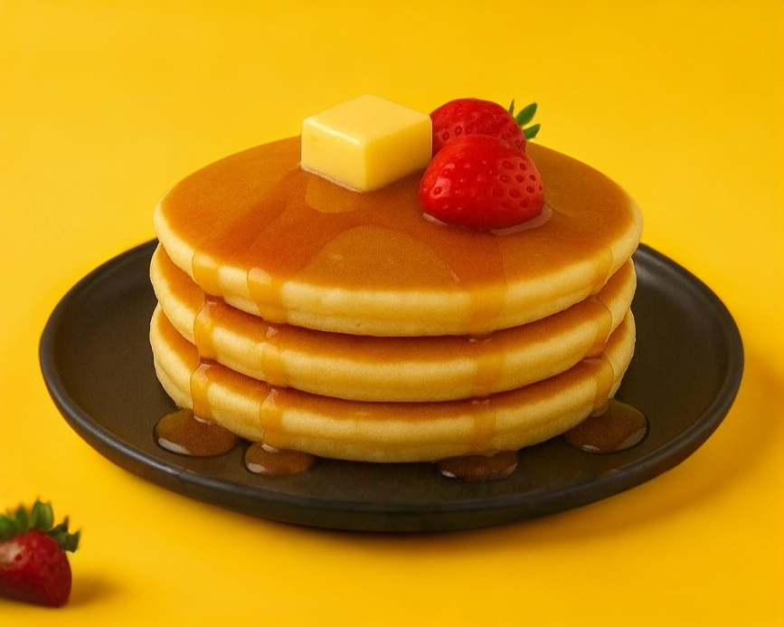 Hotcakes tradicionales con un toque de canela y vainilla, mantequilla menonita, bañados en cajeta 100% artesanal, decorados con fruta a elegir.
