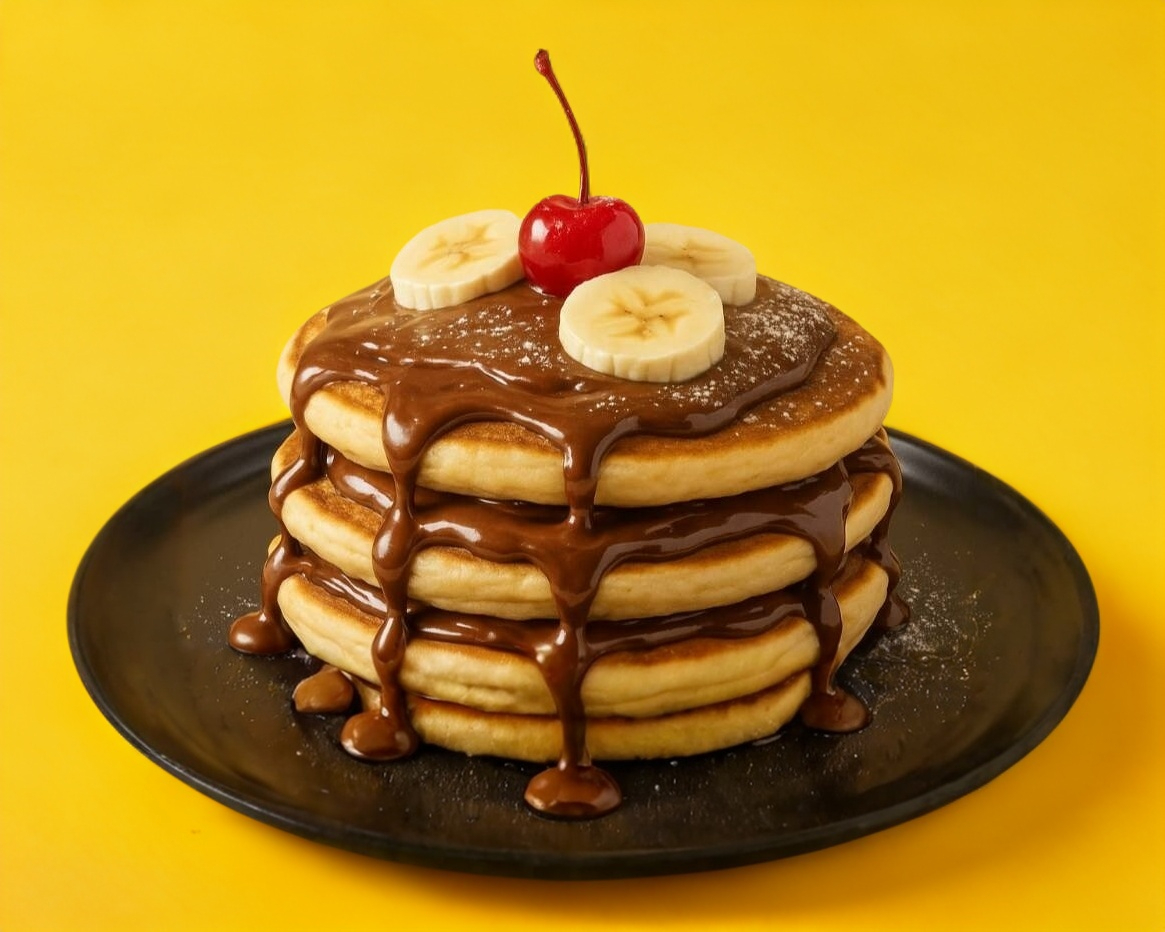 Hotcakes tradicionales con un toque de mantequilla y canela, mantequilla menonita, bañados en crema de avellana y decorados con fruta a elegir.