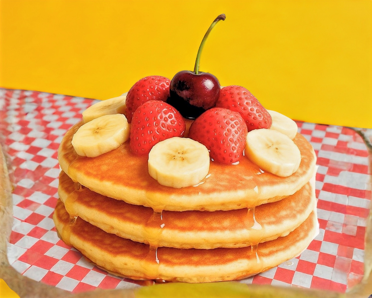 3 piezas de Hotcakes, preparados con Canela, Vainilla, Mantequilla menonita, decorados con fruta fresca bañados en Miel de Maple
