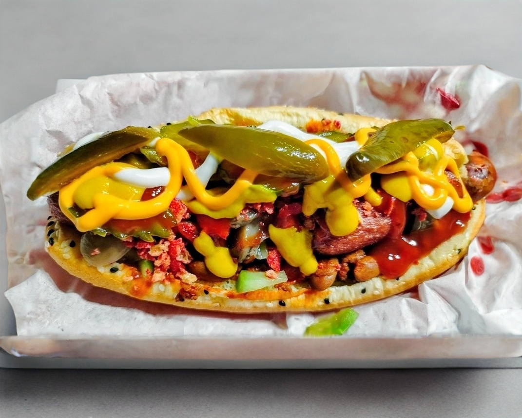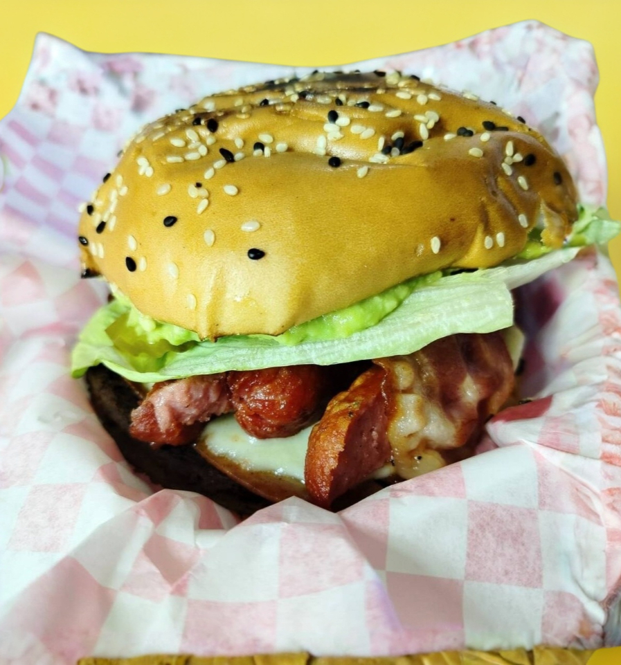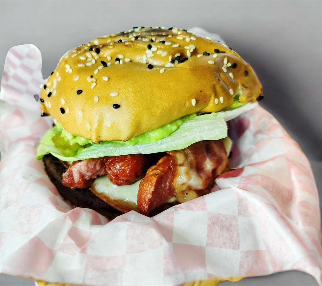 Dos Carnes Artesanal 100% Sirloin 1/4 de Libra C/U, tocino, 2 jamónes de pavo, 2 quesos amarillos tipo americano y 2 blanco laurel, salchicha para asar tipo Alemána,aguacate, lechuga y tomate. Champiñon, pepinillos cebolla morada, aderesos