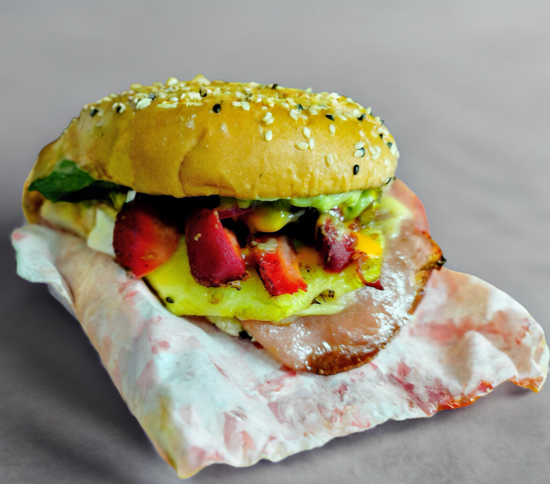 Dos Carne Artesanal 100% Sirloin 1/4 De libra C/U, tocino, 2 jamón de pavo, 2 quesos amarillo tipo americano y 2 laurel , aguacate, lechuga y tomate. Pepinillo champiñon cebolla morada y Aderesos