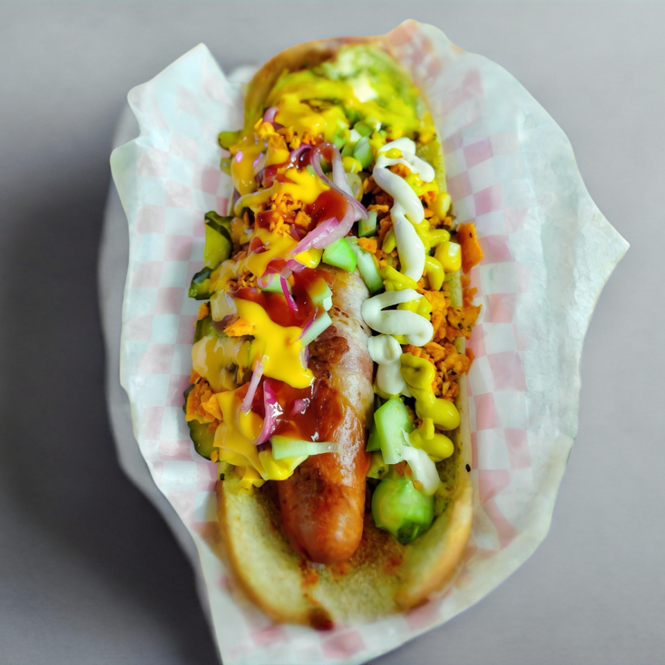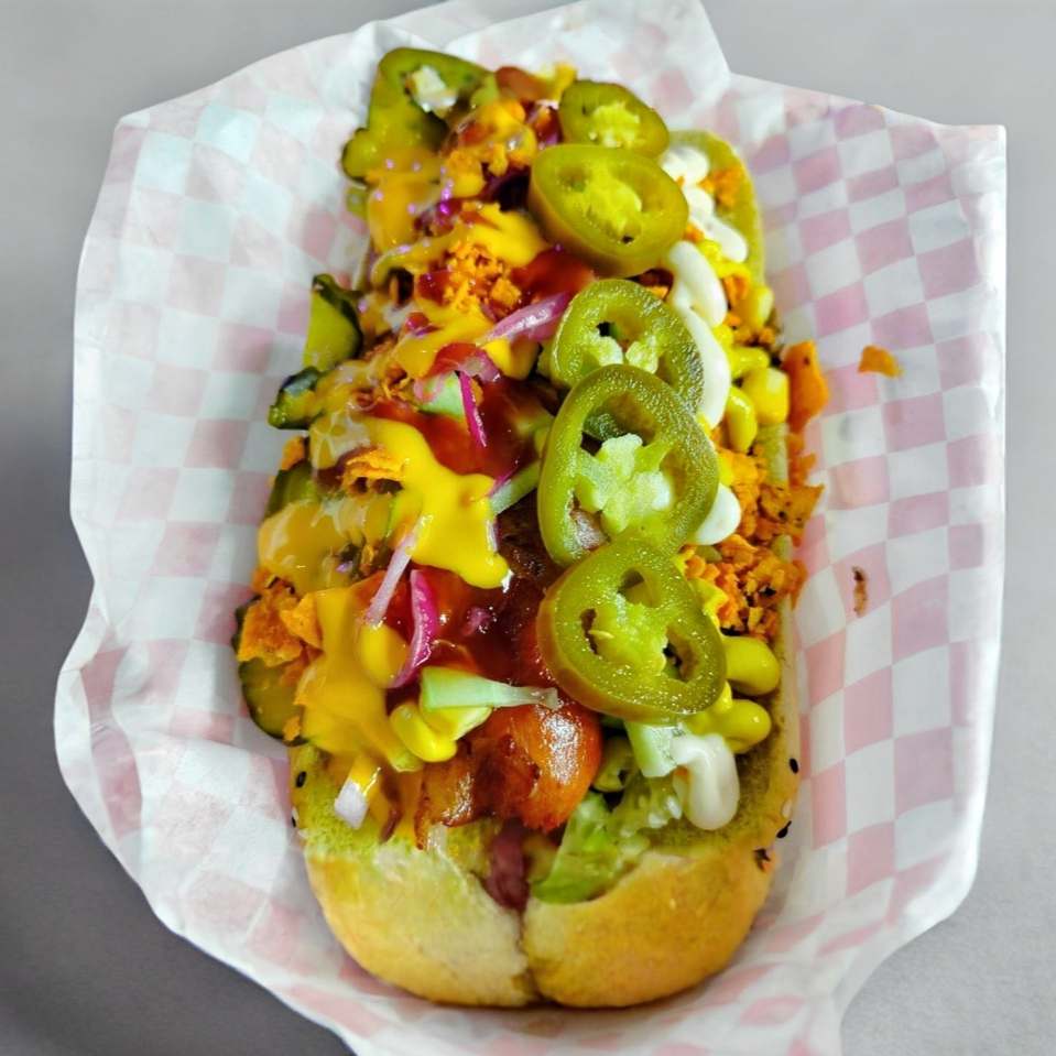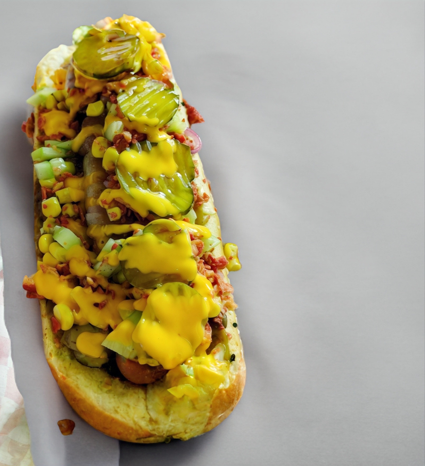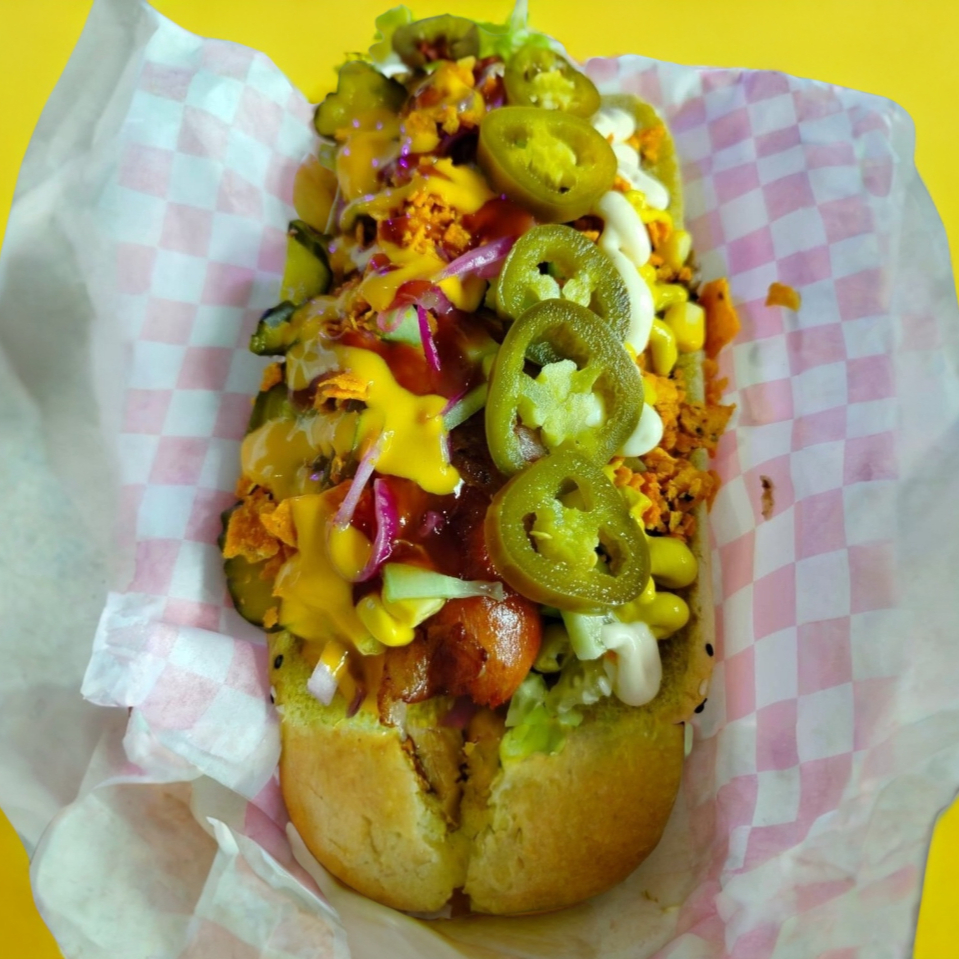 175g de Salchicha polaca sabor queso jalapeño, rellena de mas queso laurel enbuekta en tocino frito, pepinillos, pepino, elote amarillo, champoñones, cebolla morada, papitas quebradas, queso amarillo, queso parmesano y aderezos