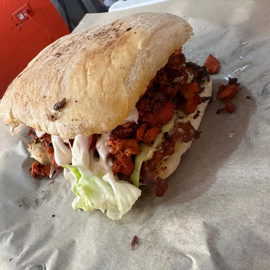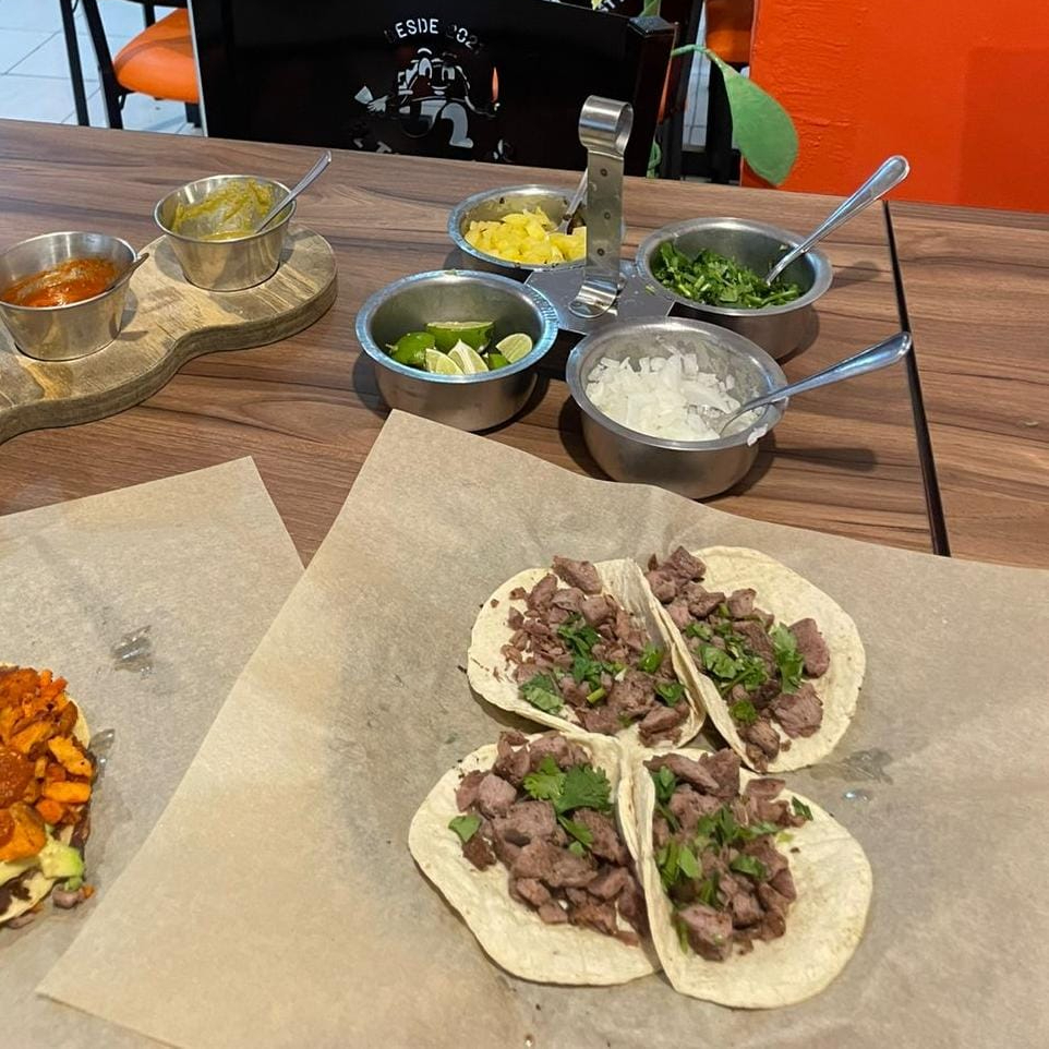 Carne de trompo al pastor, acompañado de tortillas, verdura y salsas (roja del árbol, verde jalapeño y aguacate y tatemada jalapeño y tomate).