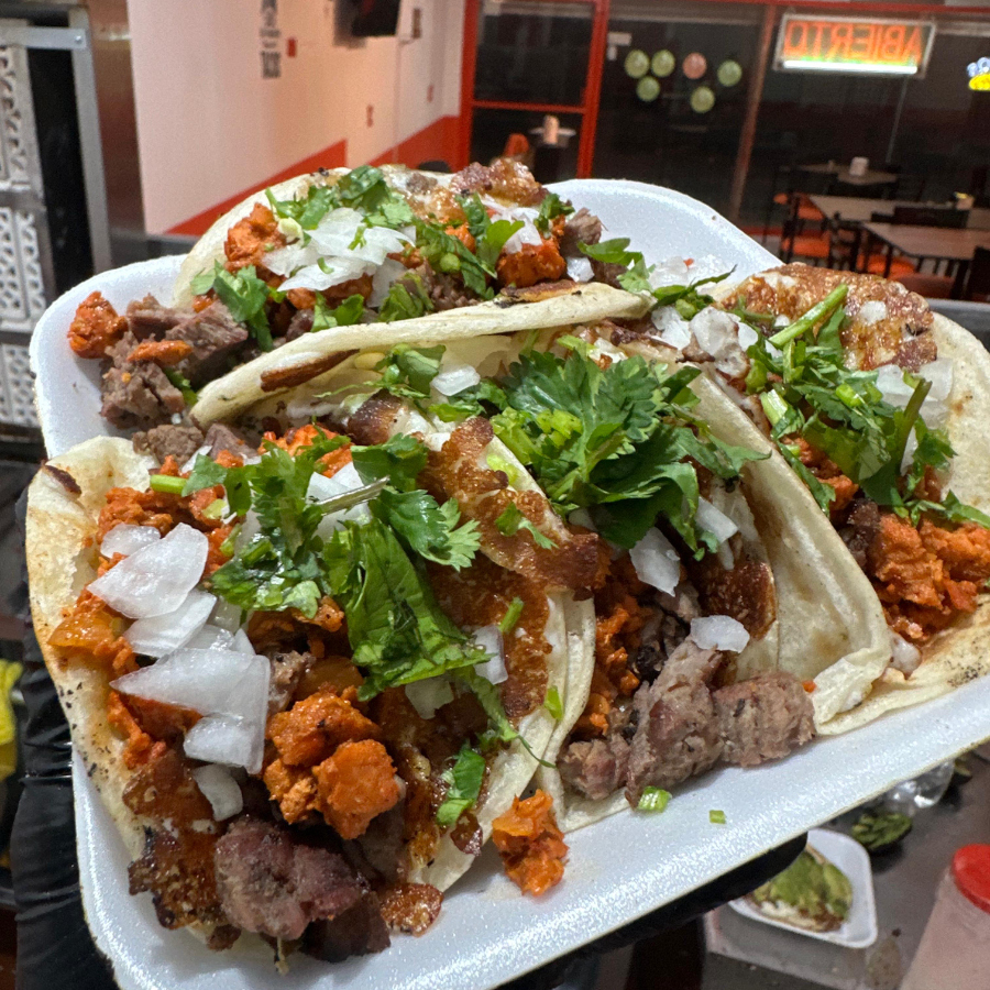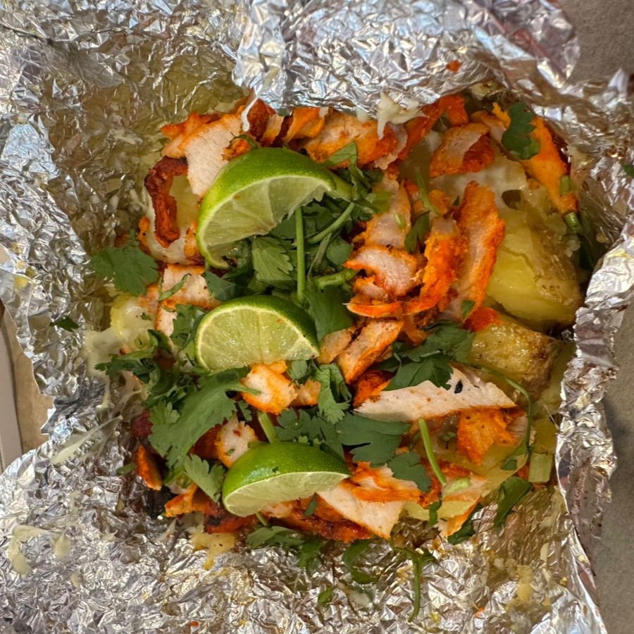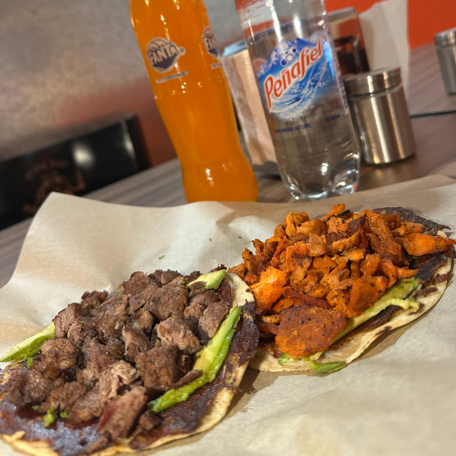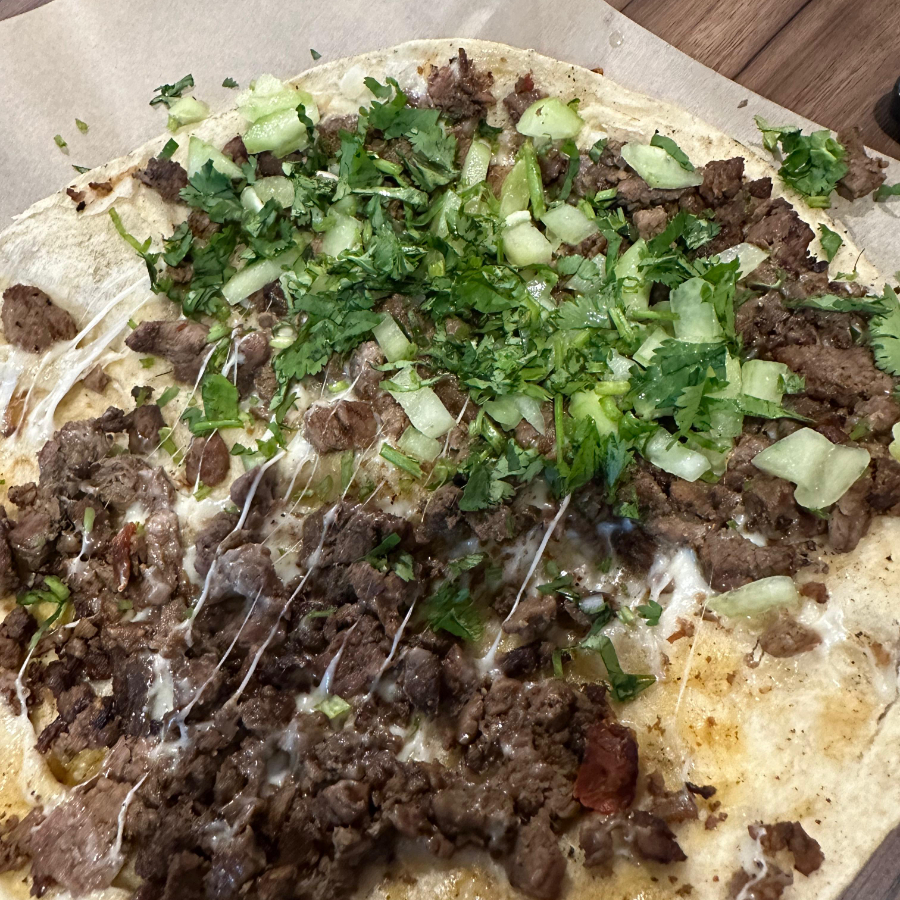 Tortilla de harina con costra de queso, carne asada, trompo al pastor, cebolla y cilantro.