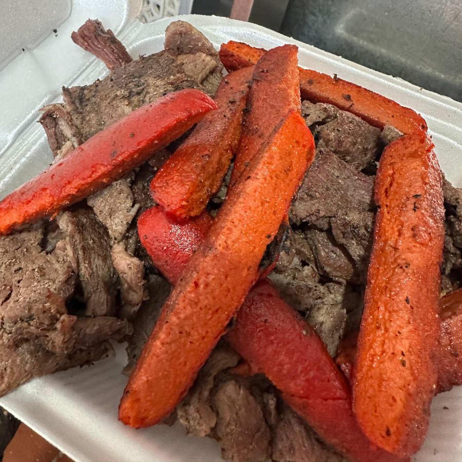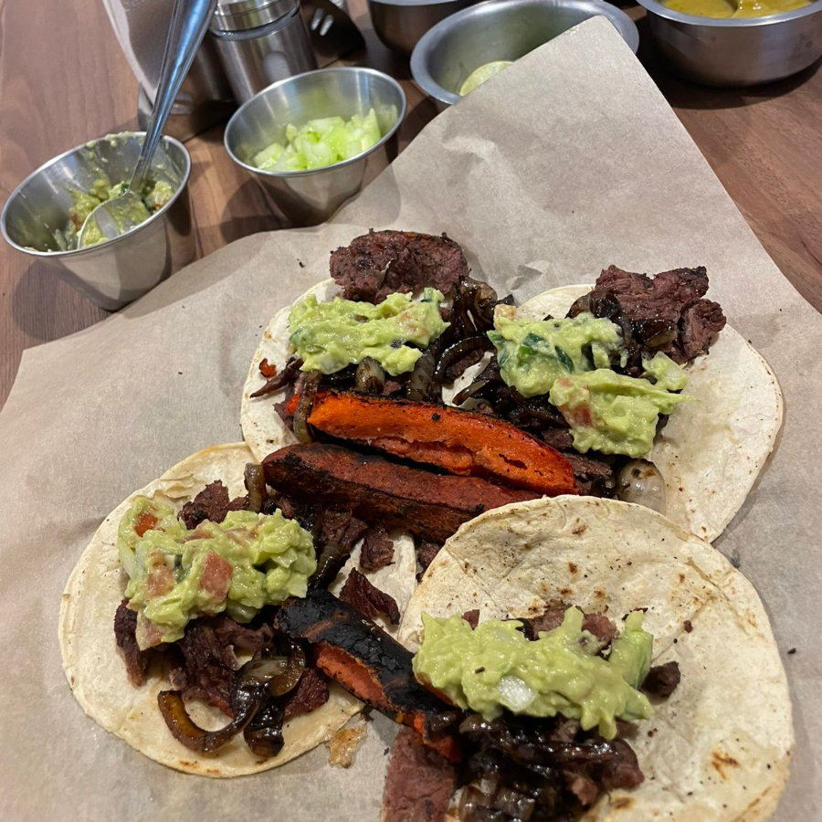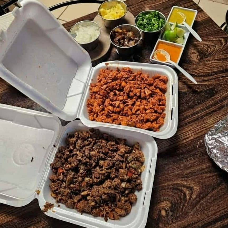Carne de res, acompañado de tortillas, verdura y salsas (roja del árbol, verde jalapeño y aguacate y tatemada jalapeño y tomate).