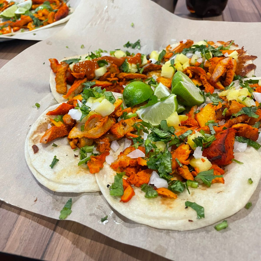 CARNE DE TROMPO AL PASTOR, SERVIDO CON CEBOLLA, CILANTRO Y PIÑA