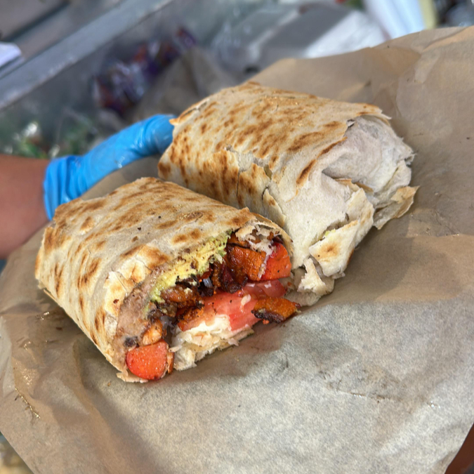 TORTILLA DE HARINA JUMBO, PREPARADO CON SALCHICHA ASADA, QUESO MOZZARELLA, FRIJOLES REFRITOS, TOMATE Y AGUACATE