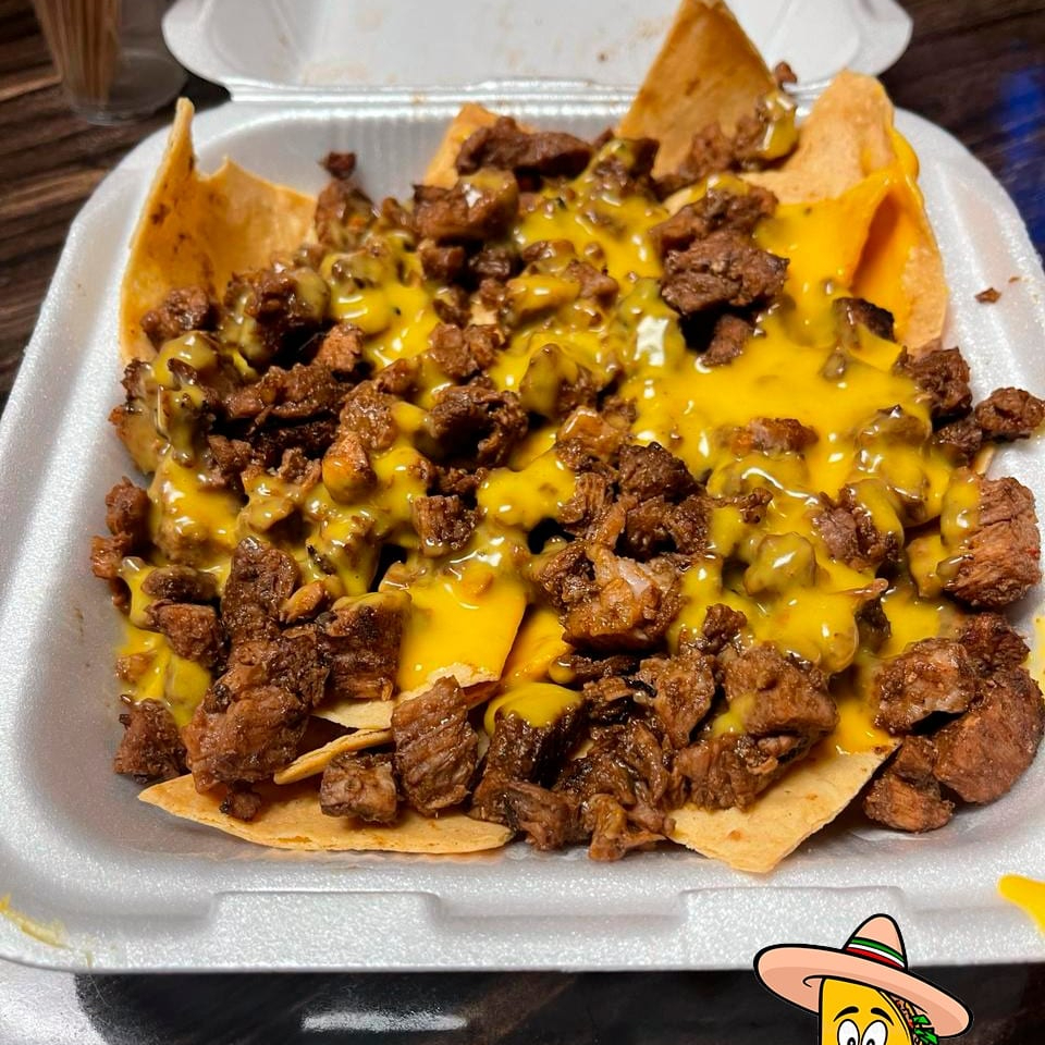 Carne y frituras de tu elección, preprados con verdura y queso para nachos.
