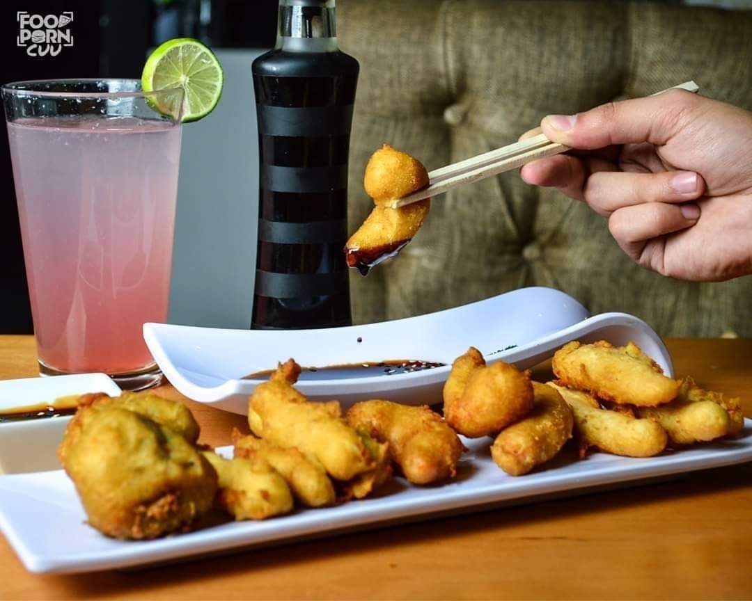 Camarones y vegetales capeados, acompañados de salsa teriyai de la casa