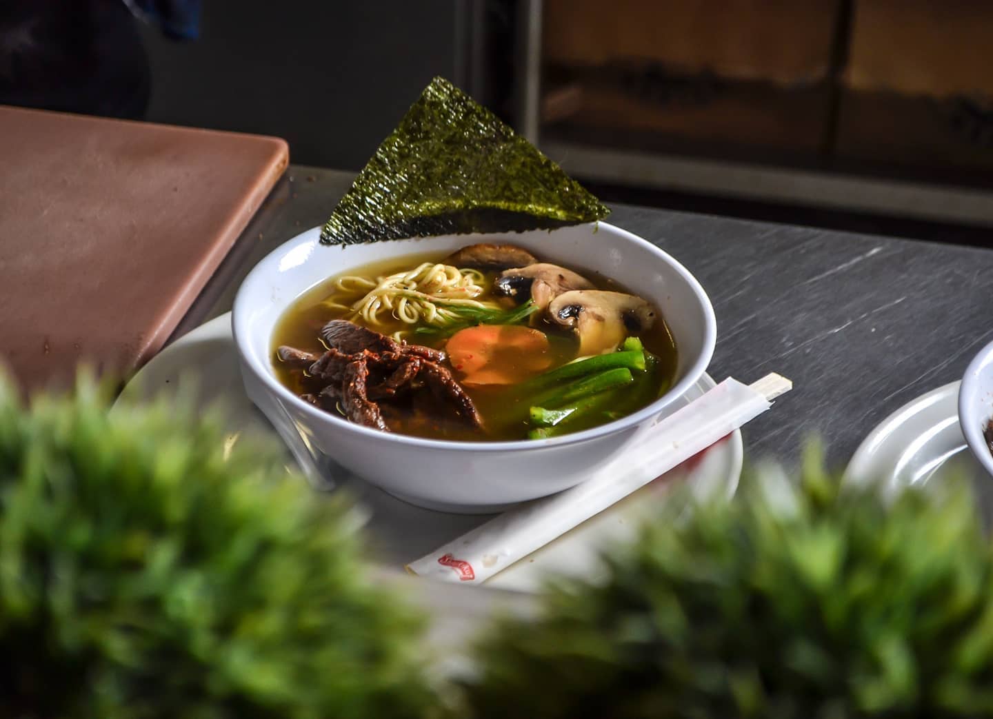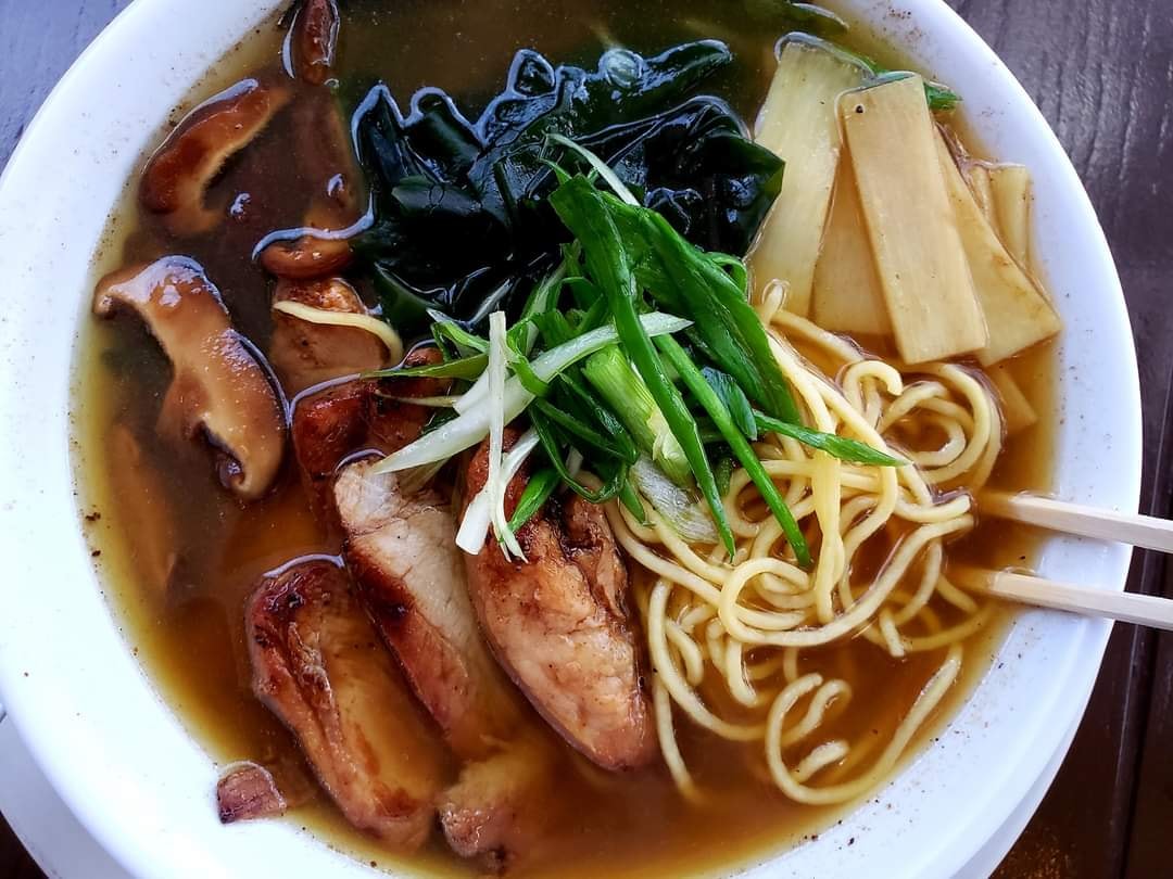 Fideos de huevo con carne de res marinada en salsa de soya picante, acompañada de champiñones, pimiento verde, y cebolla de rabo en caldo de shoyu.