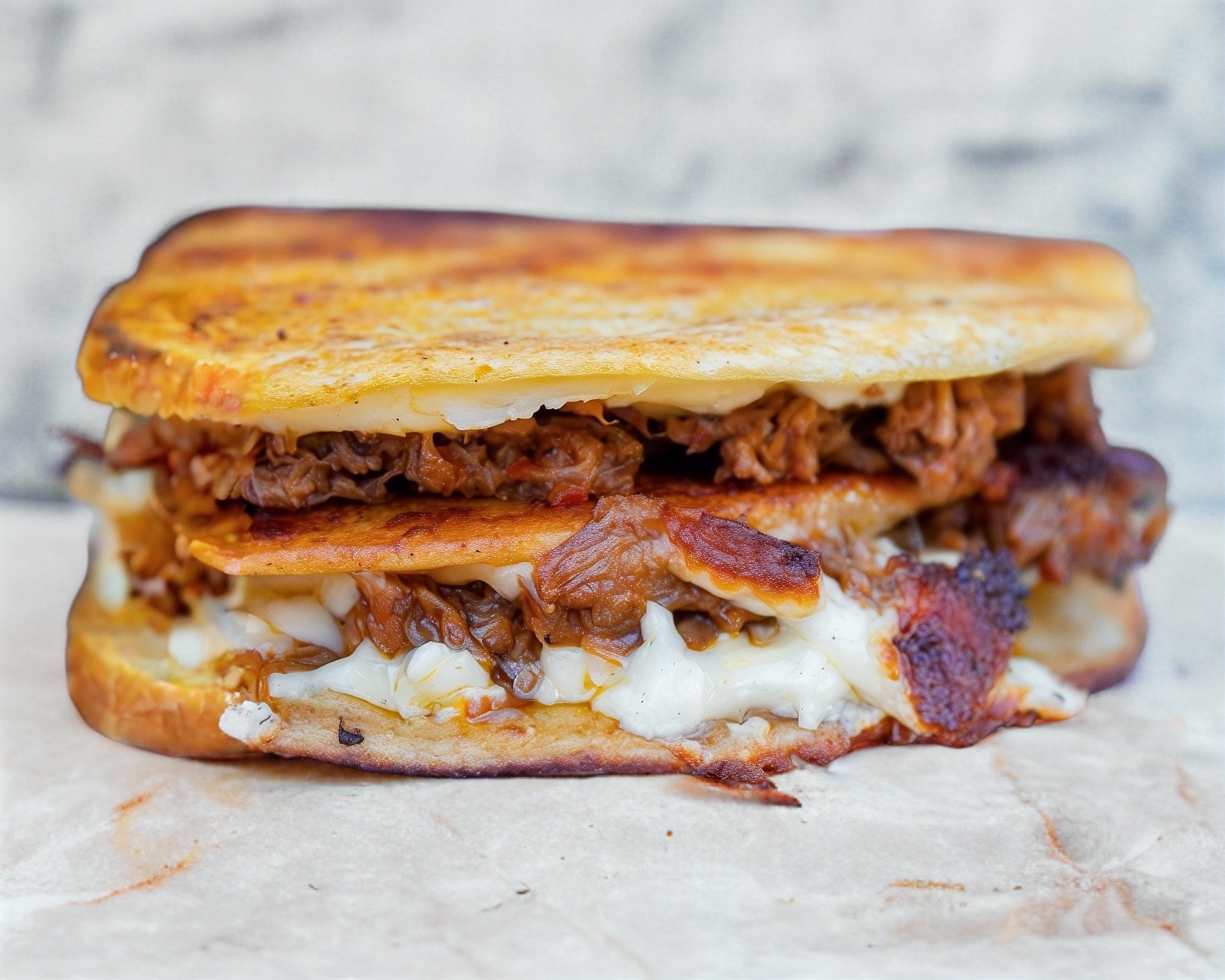 Quesadilla con jugosa carne de birria en una tortilla taquera de maíz dorada en caldo.
