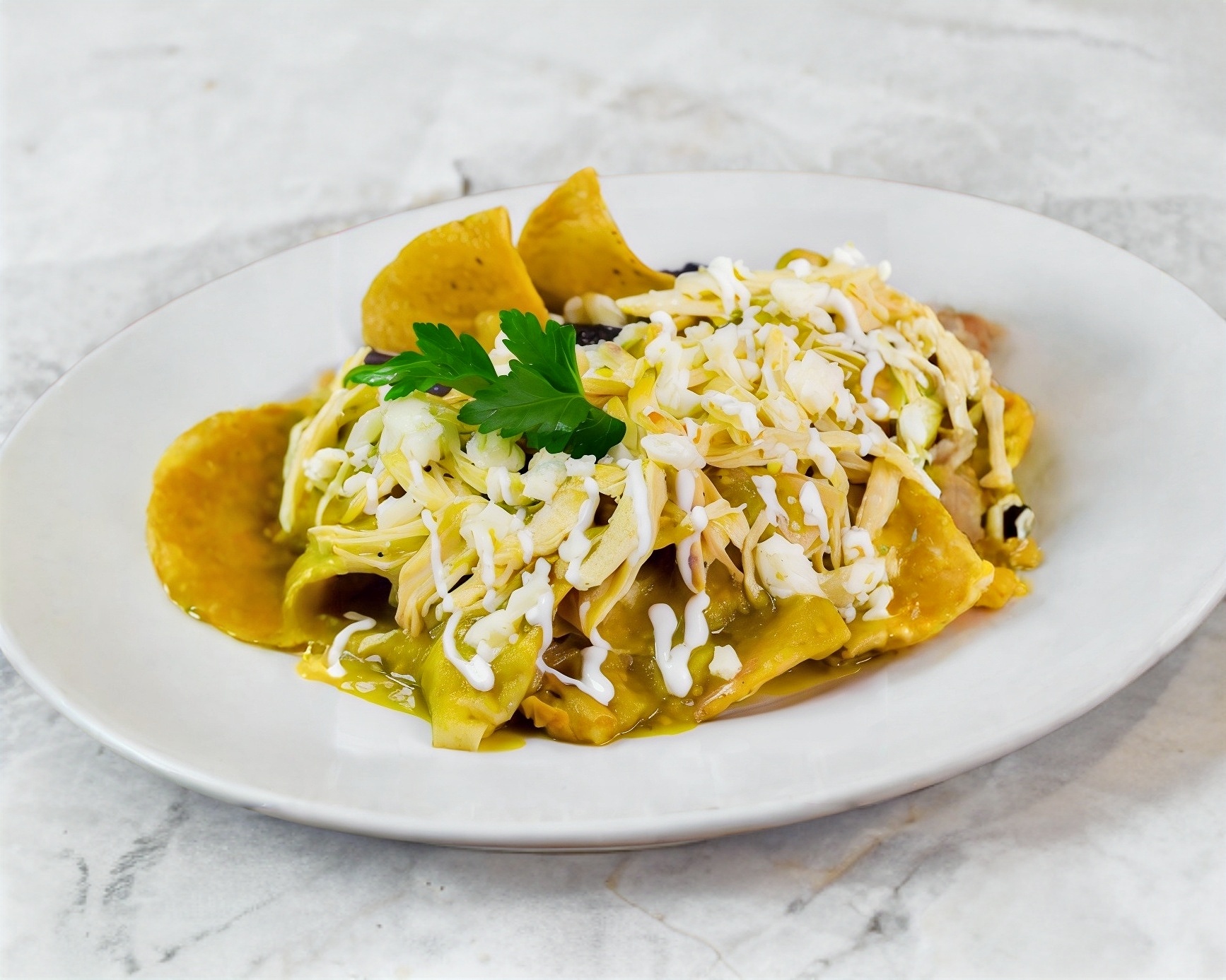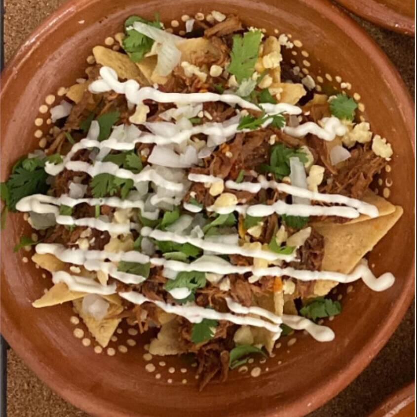 Deliciosos chilaquiles bañados en la salsa de tu elección. acompañados de crema, cilantro y cebolla