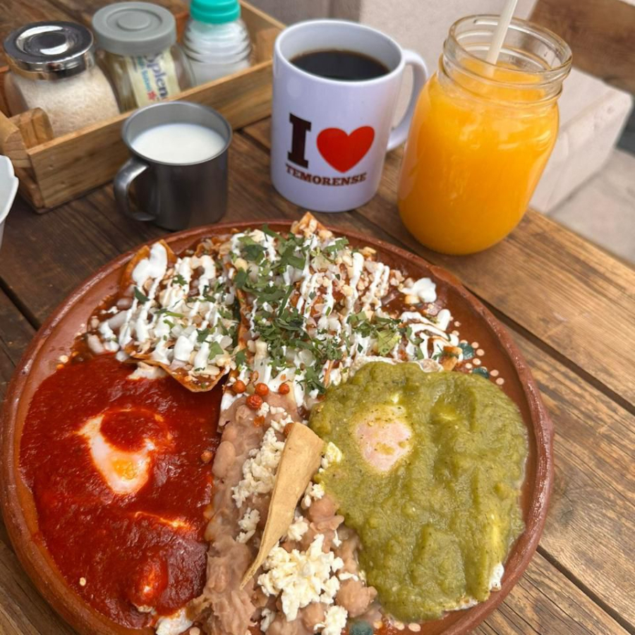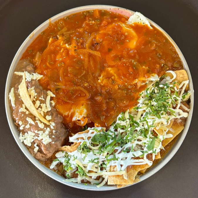 Deliciosos huevos divorciados, acompañados de frijolitos puercos o refritos y nuestros tradicionales chilaquiles bañados en salsa de consomé, con cebolla fresca, crema y cilantro, para un sabor inigualable.