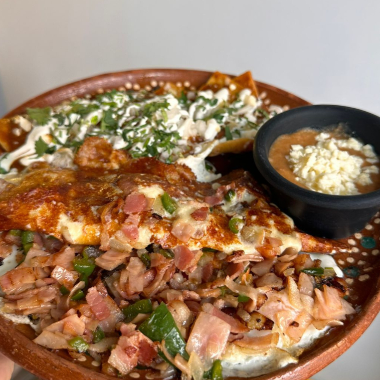 Dos deliciosos huevos acompañados de crujiente tocino, jamón y fresco pico de gallo, todo sobre una dorada costra de queso. Se sirven con nuestros tradicionales chilaquiles y frijolitos puercos o refritos para una combinación de sabores irresistibles.