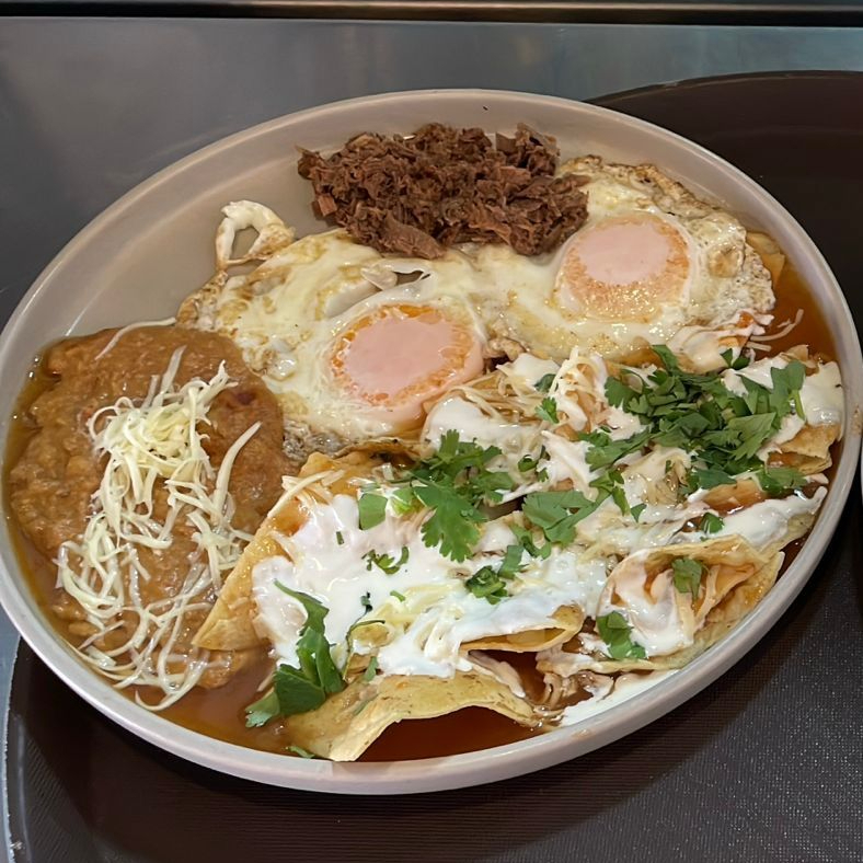 Sabrosos huevos con machaca, acompañados de nuestros irresistibles frijolitos puercos o refritos, y los tradicionales chilaquiles bañados en salsa de consomé, coronados con cebolla fresca, crema y cilantro.
