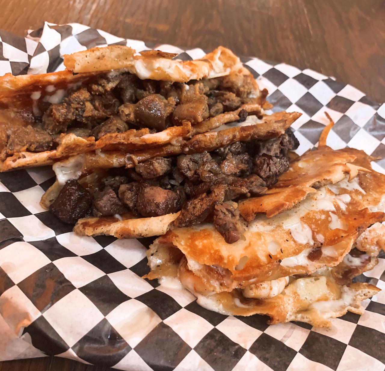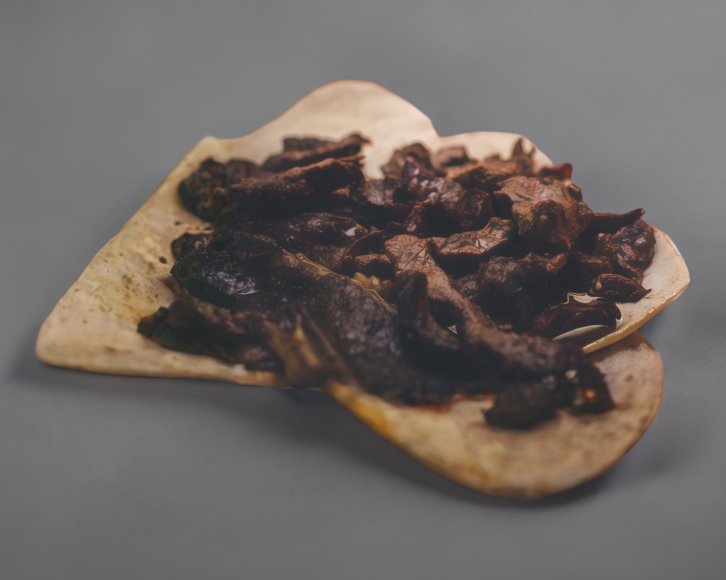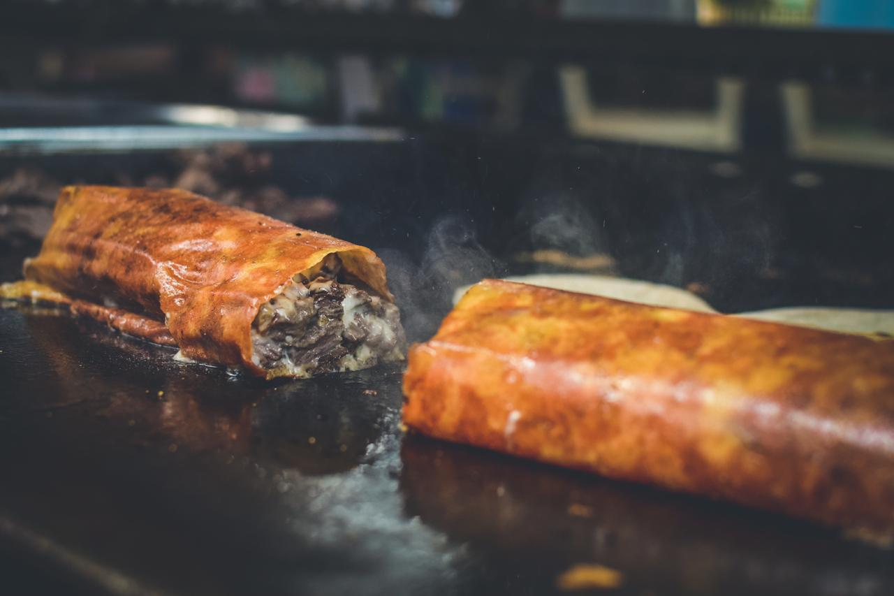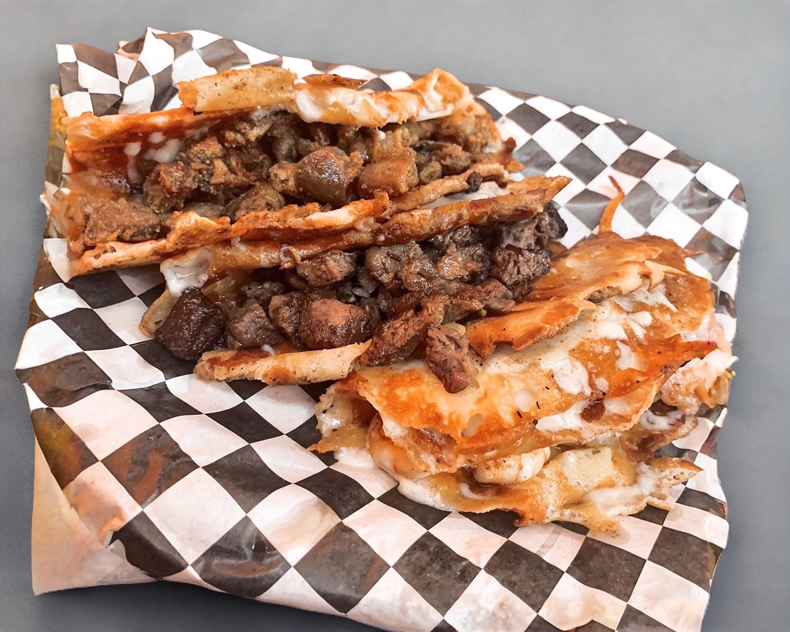 3 tortillas con una costra de queso rellena de carne asada a la maggi