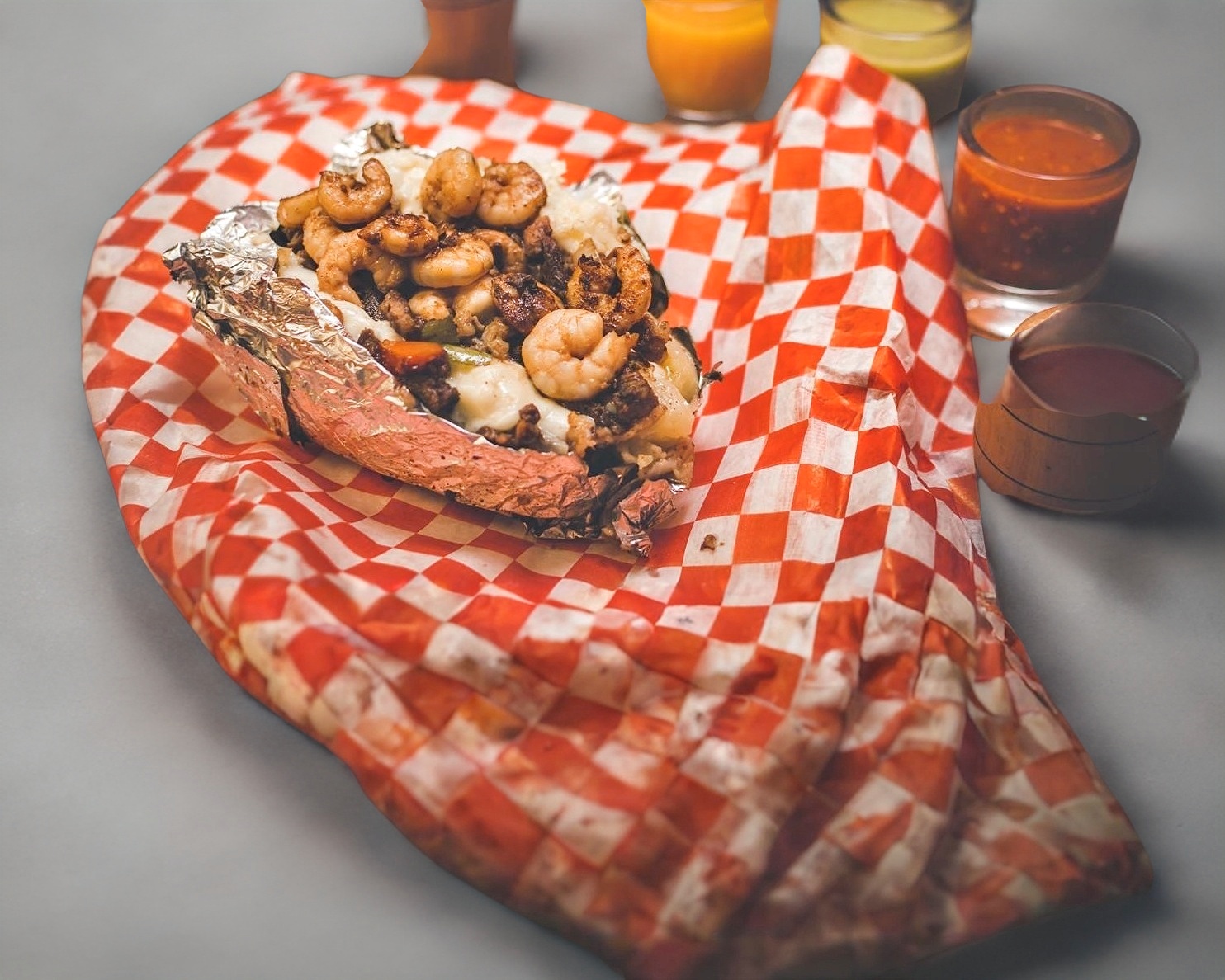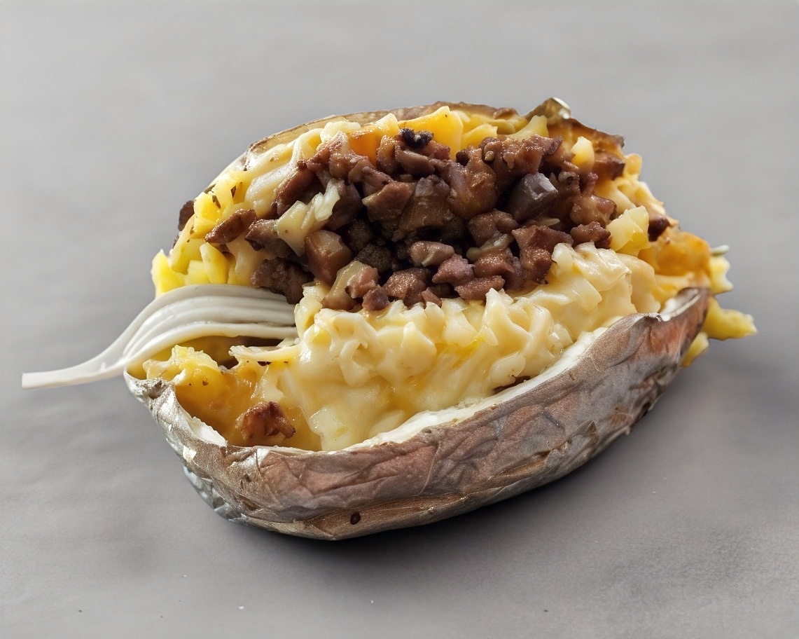 Papa asada con alambre (tocino, chile tomate, cebolla y queso).