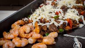 Camarón, carne, tocino, chile, tomate, cebolla y queso.