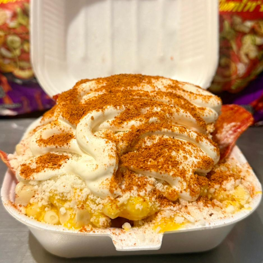 Maruchan con elote, salsa valentina, maggi, sal, limón, queso blanco, crema y chile.