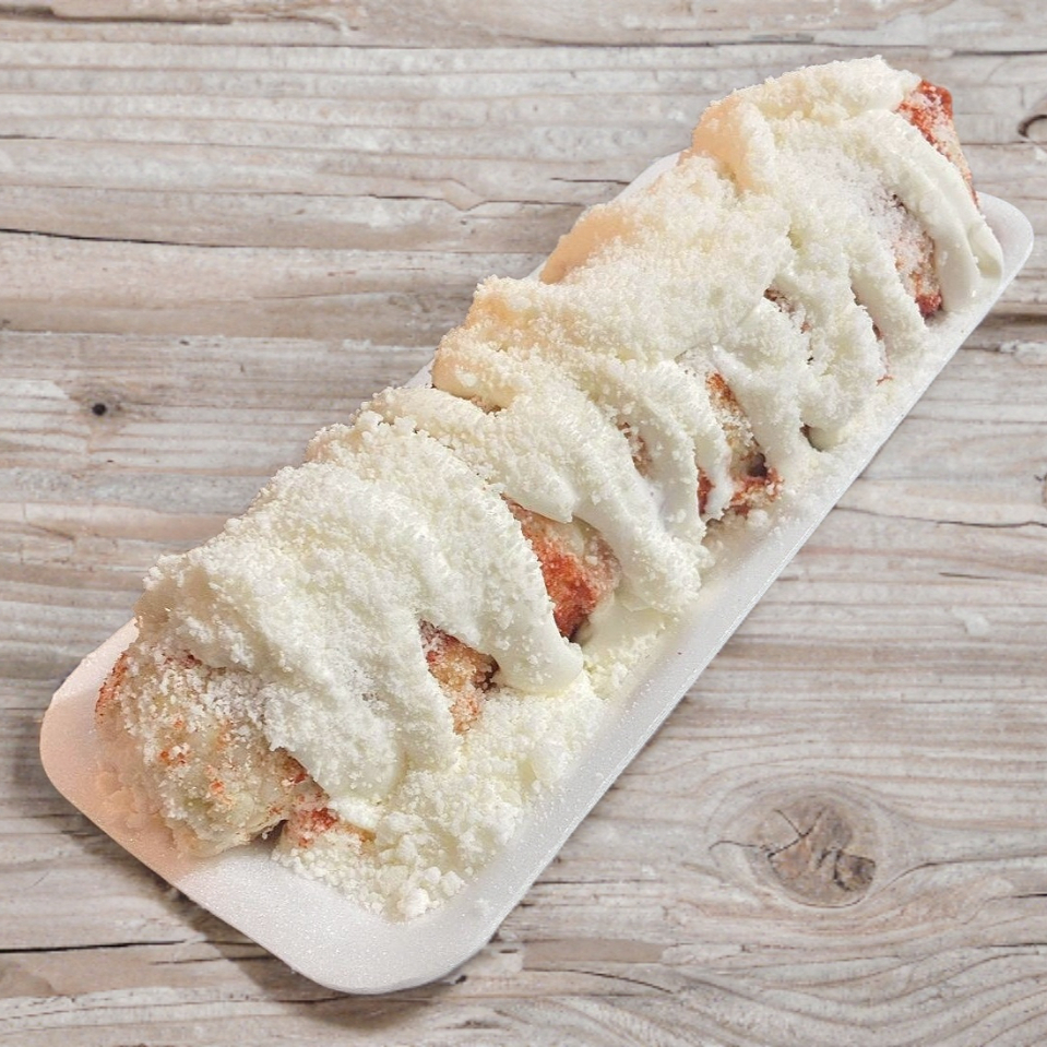 Elote entero bañado de queso amarillo, empanizado y preparado