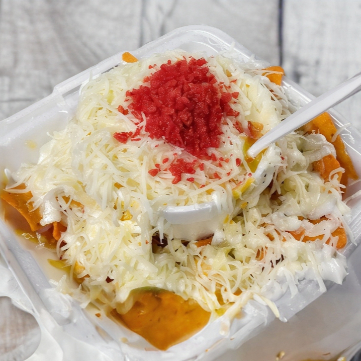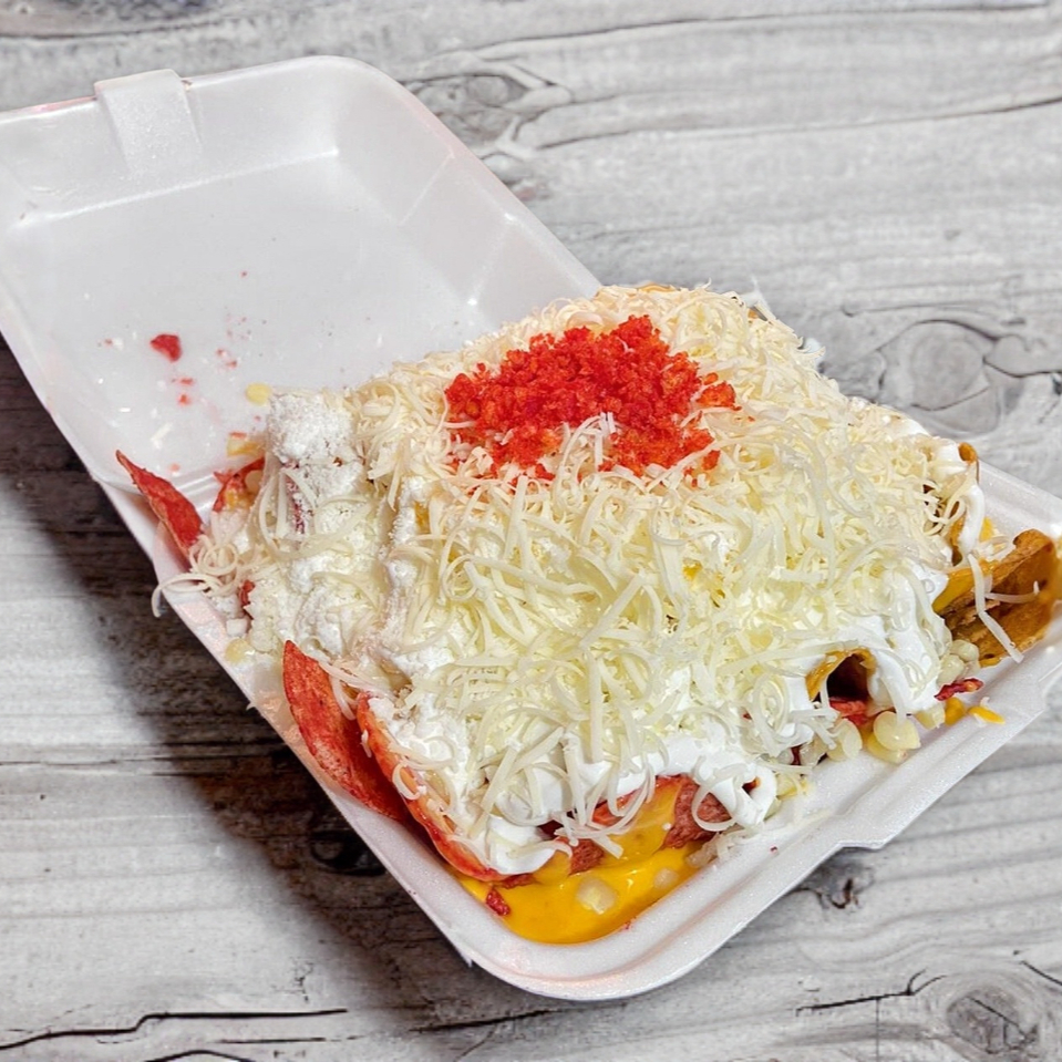 Paitas a escoger, con elote, queso amarillo, crema, queso en polvo, doritos molidos y chiles curtidos.
