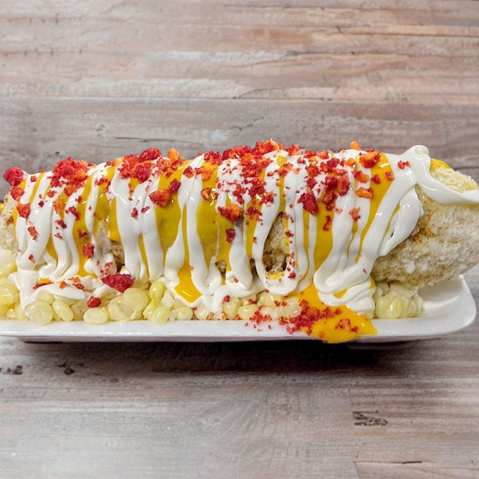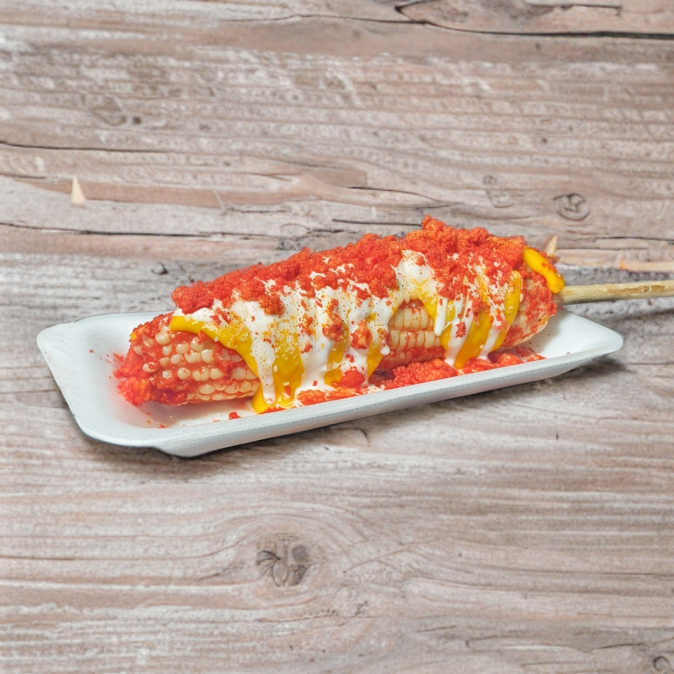 Elote entero, con una camita de elote preparado, mantequilla, crema, queso (polvo), limón, sal, chile (limón, picoso o cheetos flamin hot)