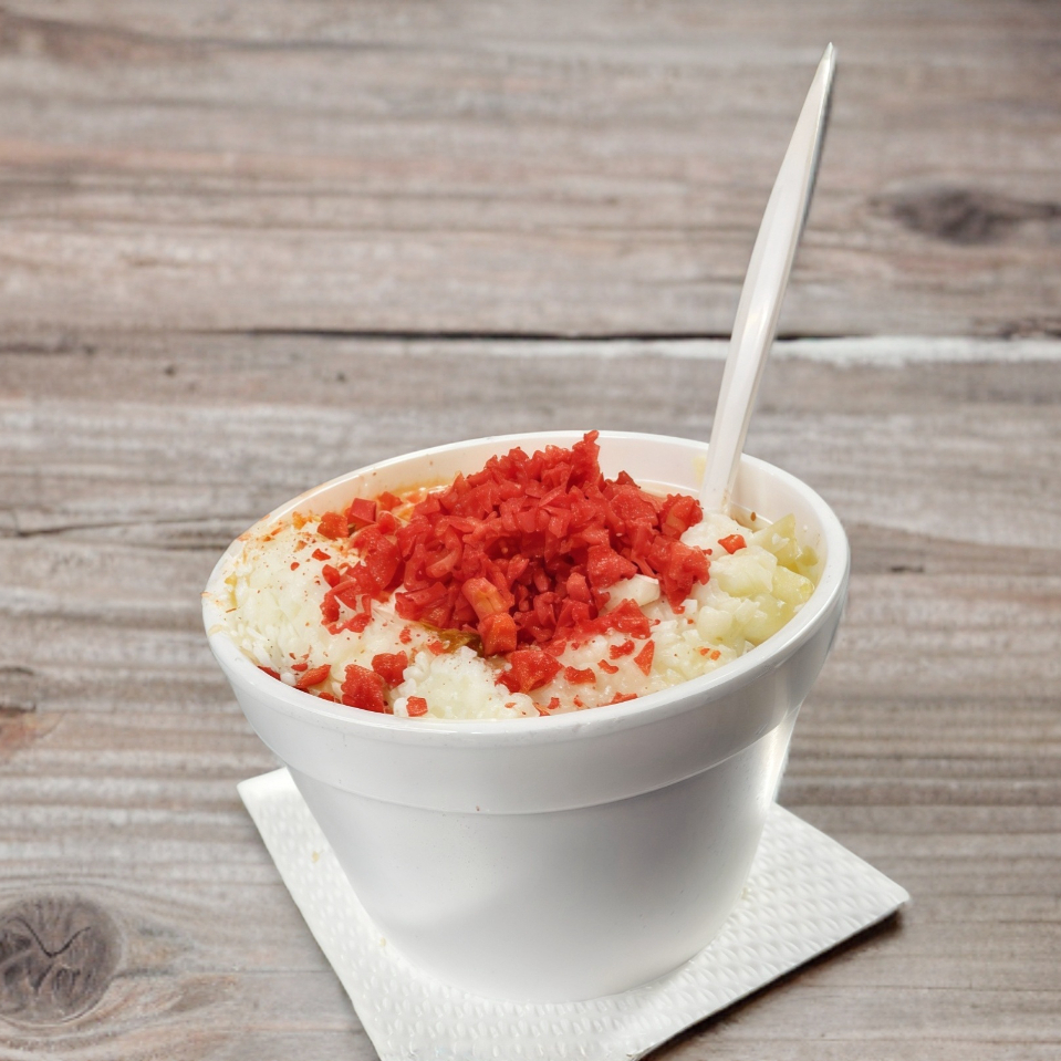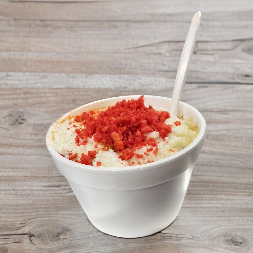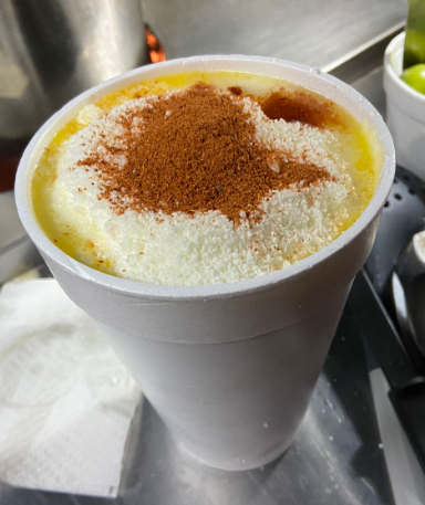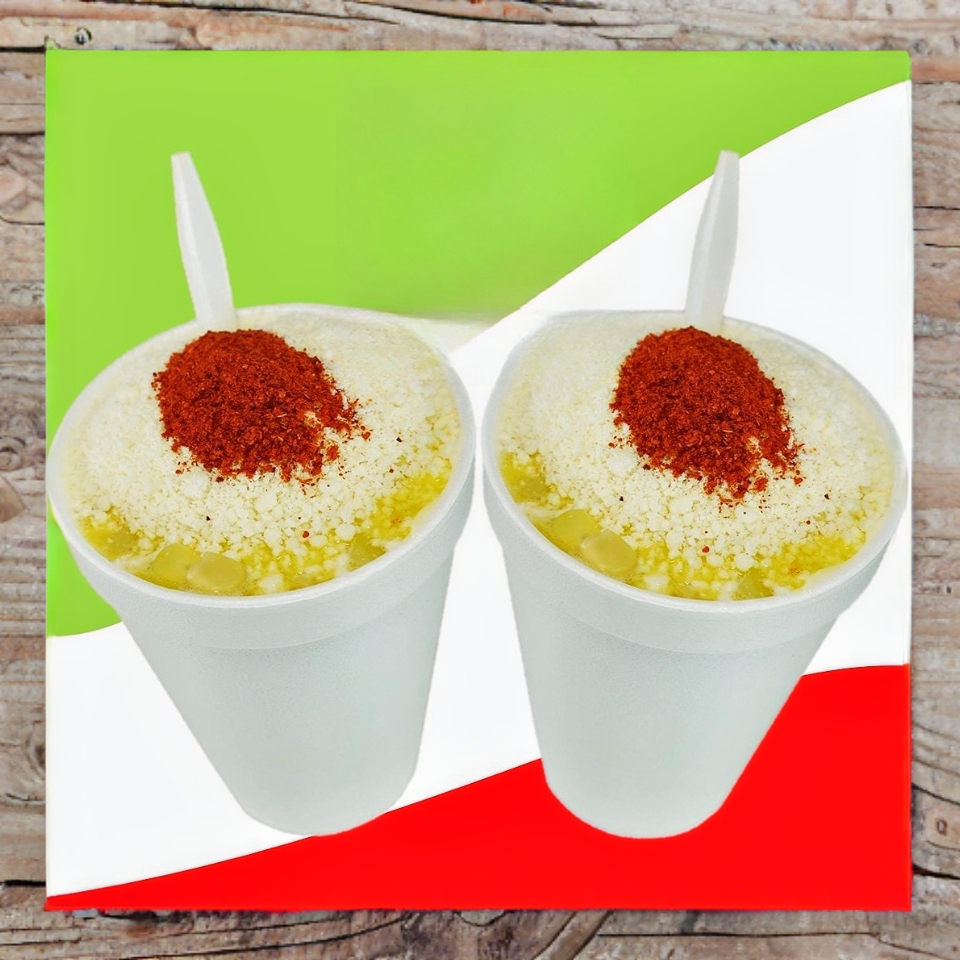 Elote en vaso de 1/2 litro incluyendo una cama de doble porción de elote preparado en charola y dos paquetes de papitas a escoger al gusto, mantequilla, crema menonita, queso en polvo, queso amarillo, queso en barra rallado, limón, sal, chile en polvo.