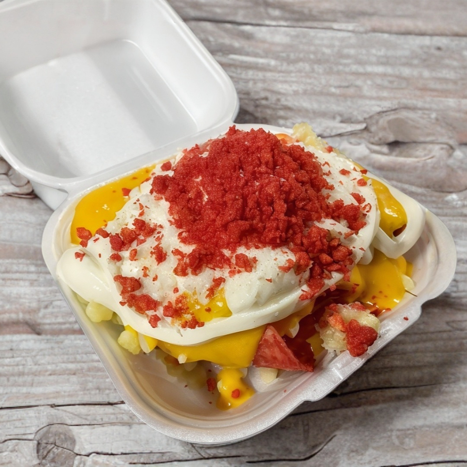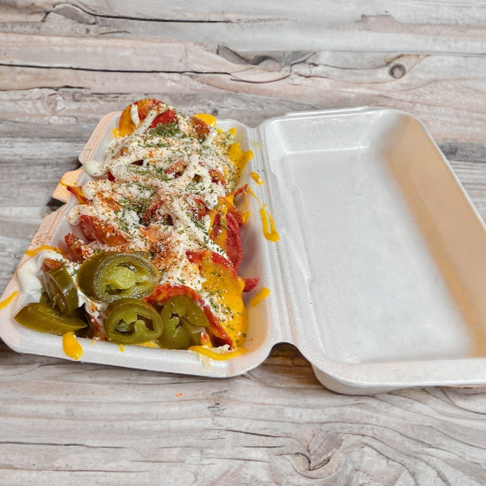 Maruchan (habanero, chile piquin, res y pollo), elote, crema, queso en polvo, limon, mantequilla, chile (de limon, picoso, cheetos flaming hot).