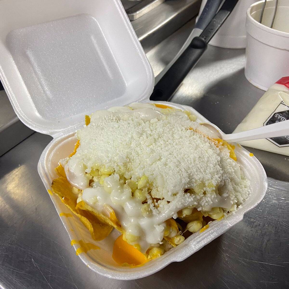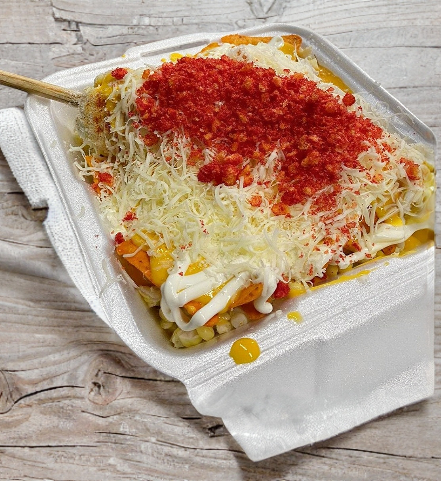 Elote en entero preparado, incluyendo una cama de elote preparado y papitas a escoger al gusto, mantequilla, crema menonita, queso en polvo, queso amarillo, queso rallado, limón, sal, chile en polvo.