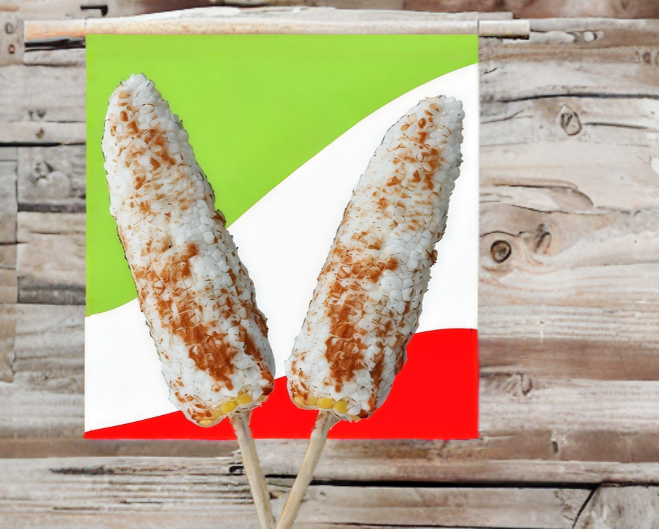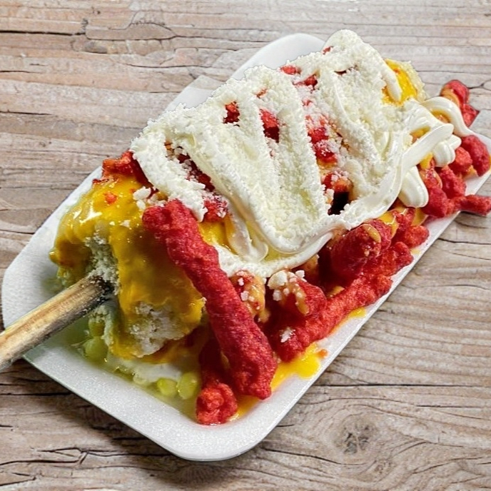 Elote, mantequilla, crema, queso en polvo, limón, sal, chile (de limón, picoso o cheetos flaming hot).