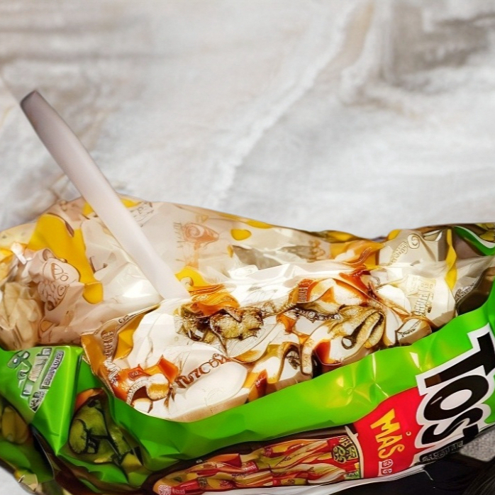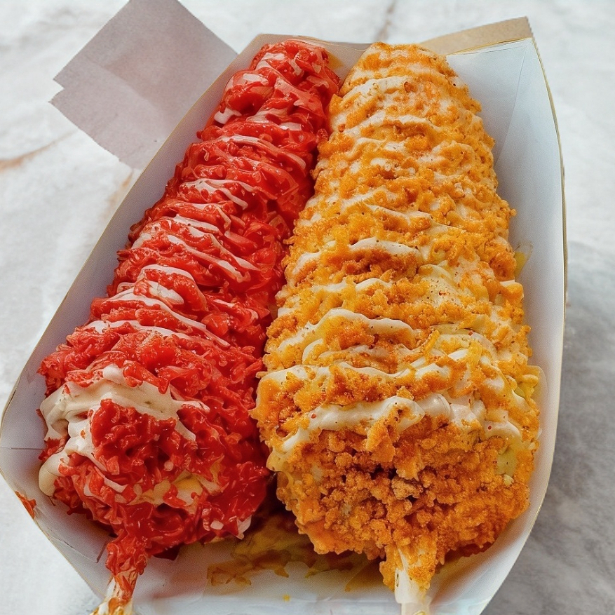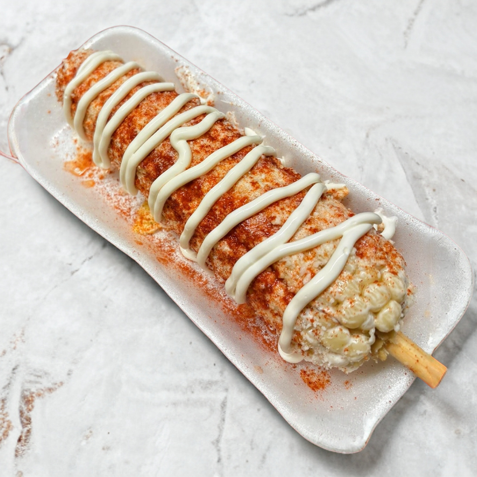 Delicioso elote entero con una capa delgada de crema para empanizar con papitas de tu elección, chorreado con queso amarillo