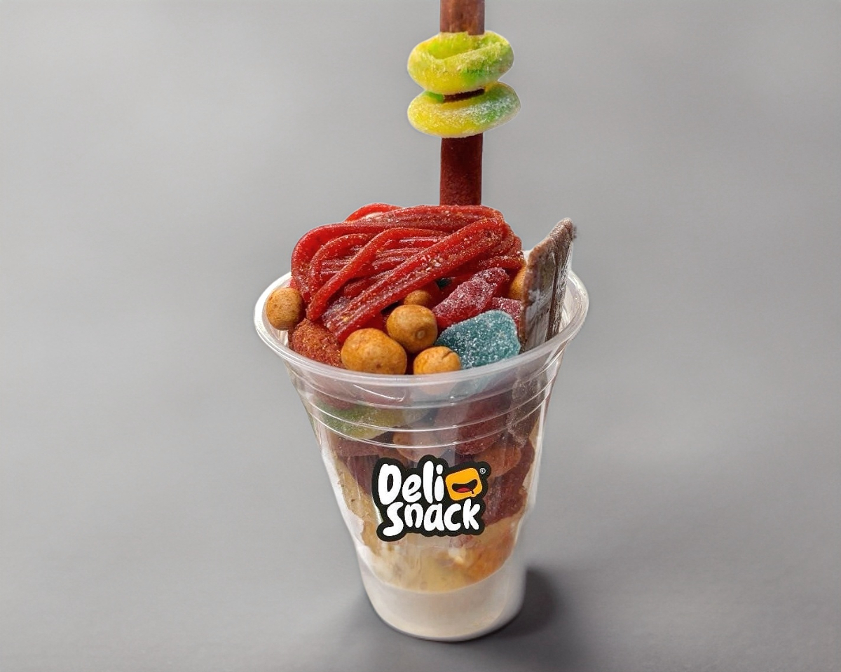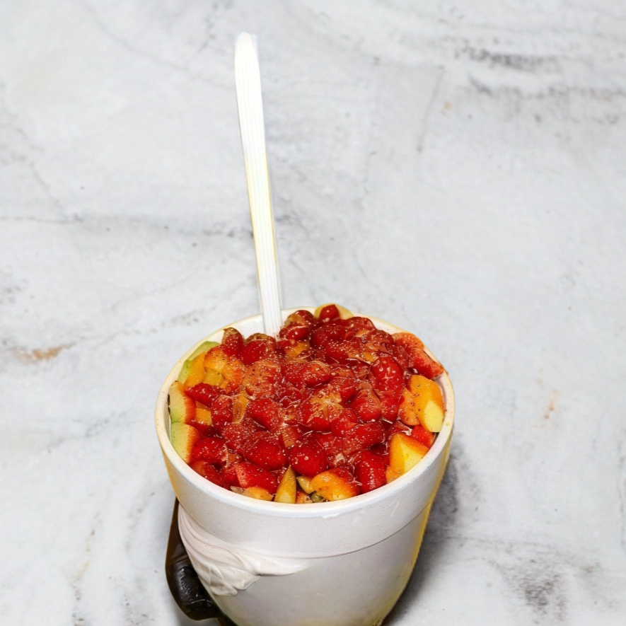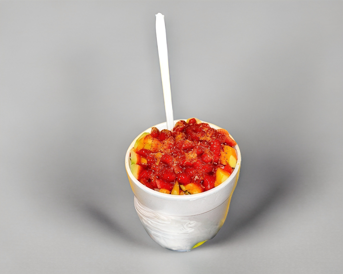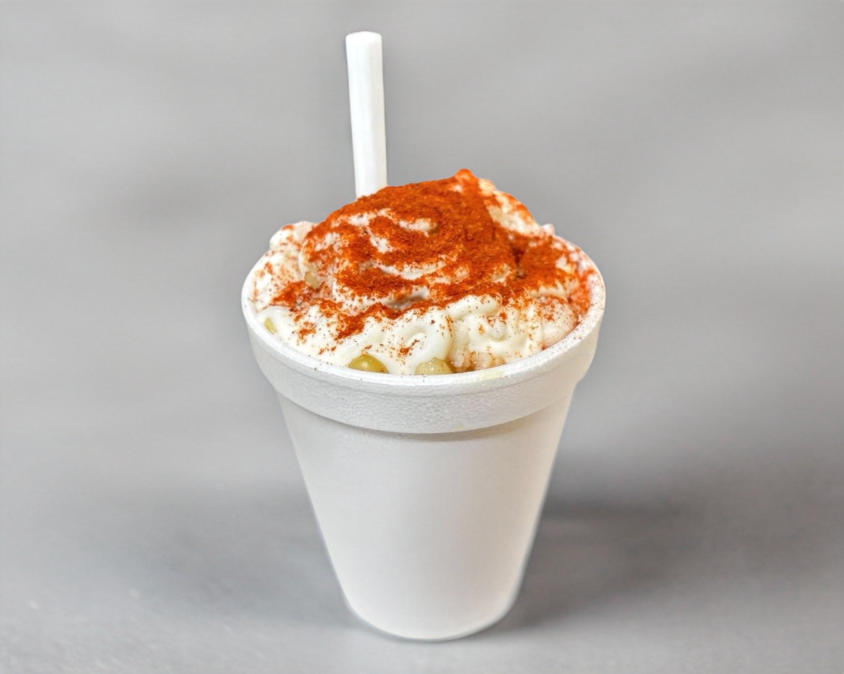 Un vaso de elote mediano montado en una cama de a tu elección con elote ,queso, crema y picantes (1 a2 personas)
