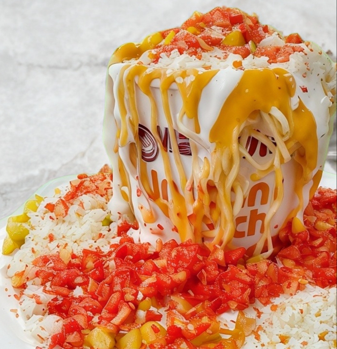Maruchan con elote de 1/2 litro, montada sobre una cama de papas a tu elección acompañadas con elote, queso y crema