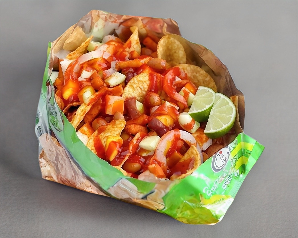 Mitad de papa casera y papitas de tu elección preparadas con pepino ,rielito, chilarines, cacahuate japones, salsas y un toque de tajin