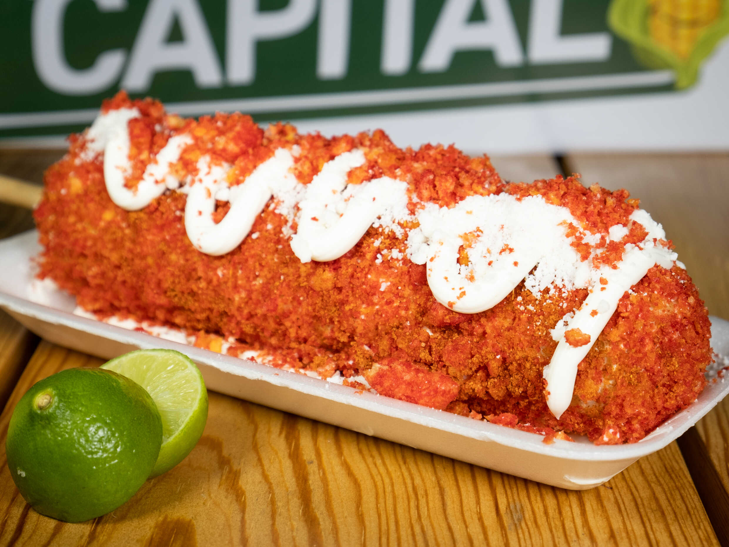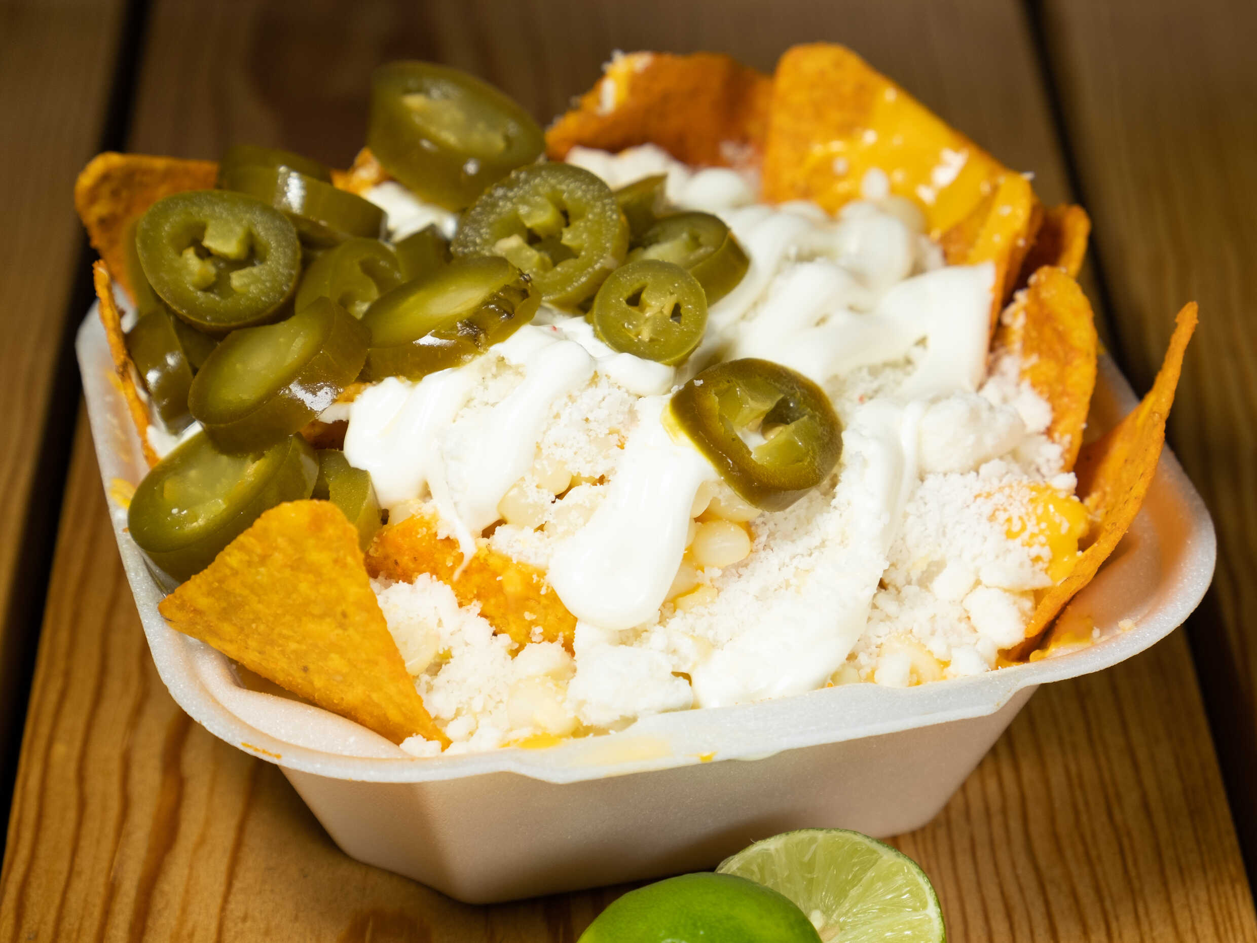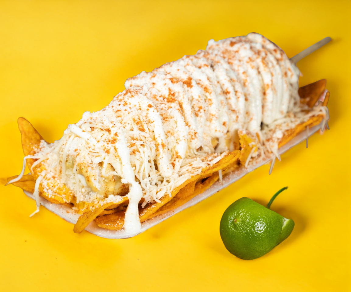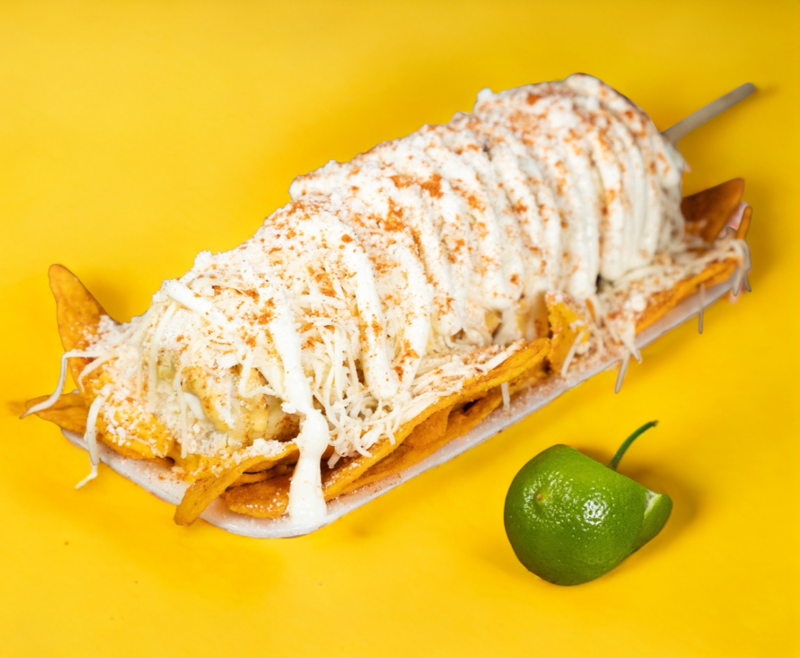 Elote Entero Preparado En Una Charola Con Doritos Alrededor.