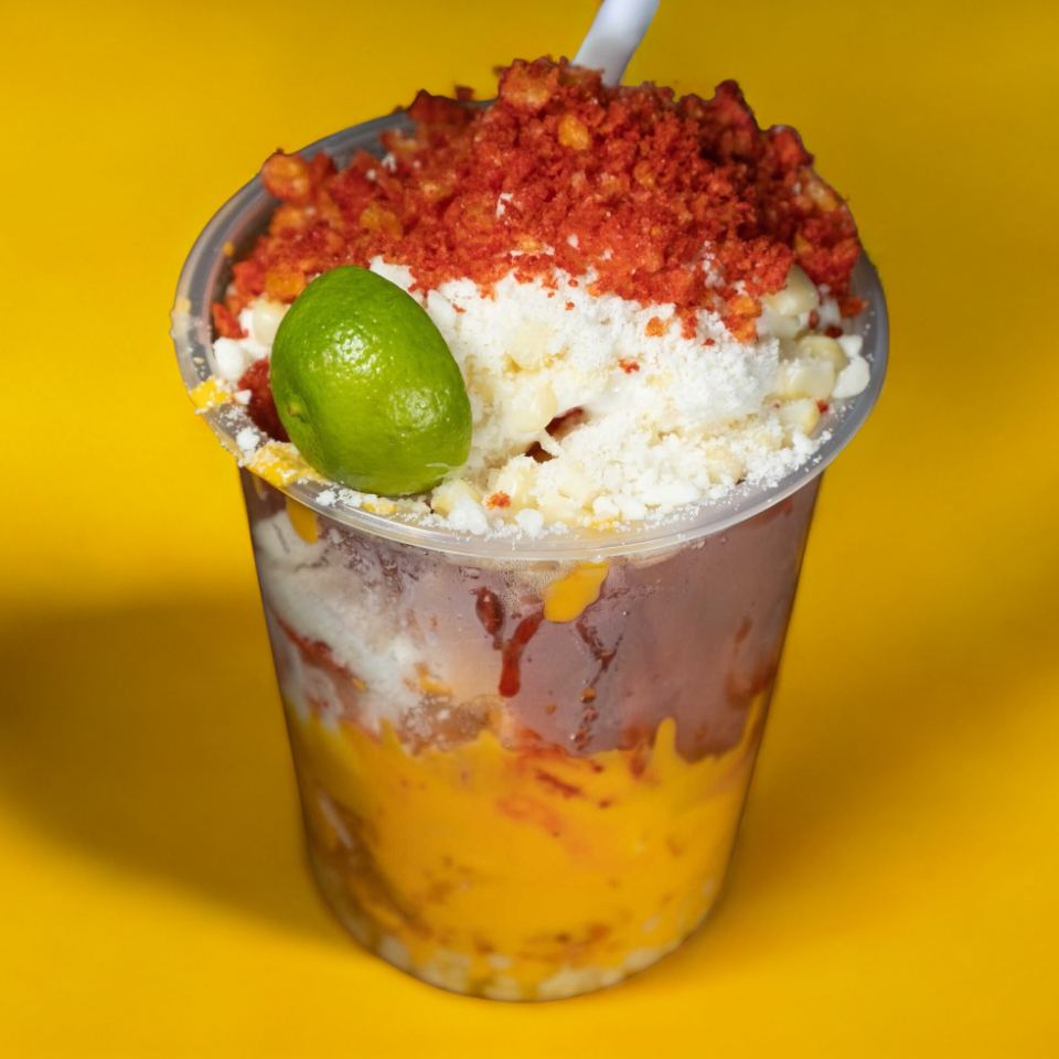 Elote en Vaso Preparado En Una Charola Con Doritos Alrededor.
