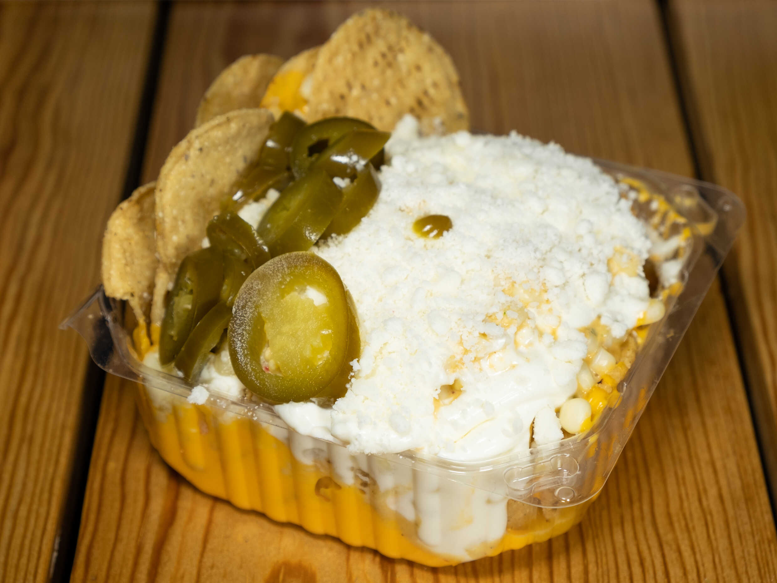 Elote Entero Con Elote Desgranado y Queso Amarillo.