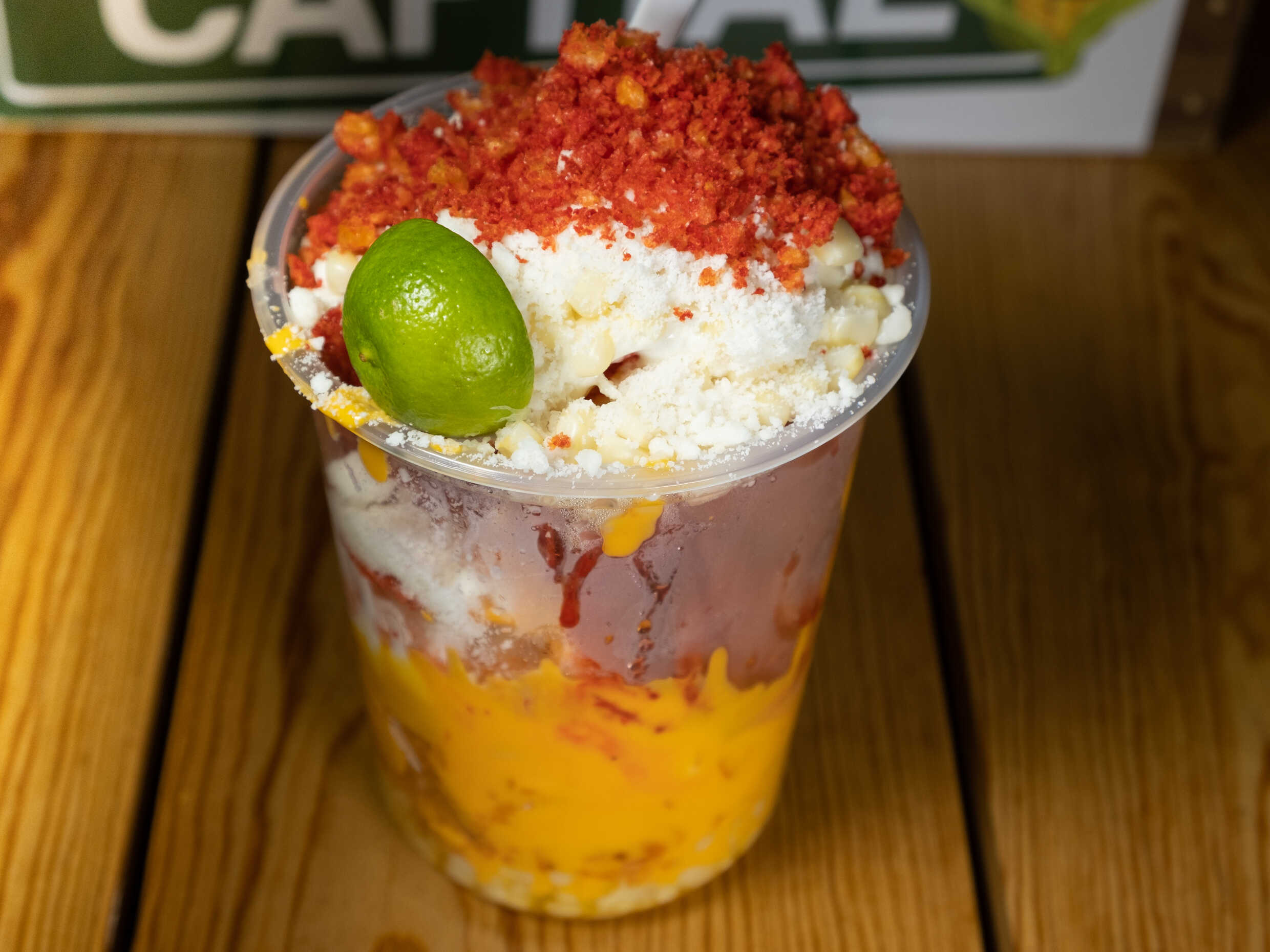 Elote en Vaso Preparado En Una Charola Con Doritos Alrededor.