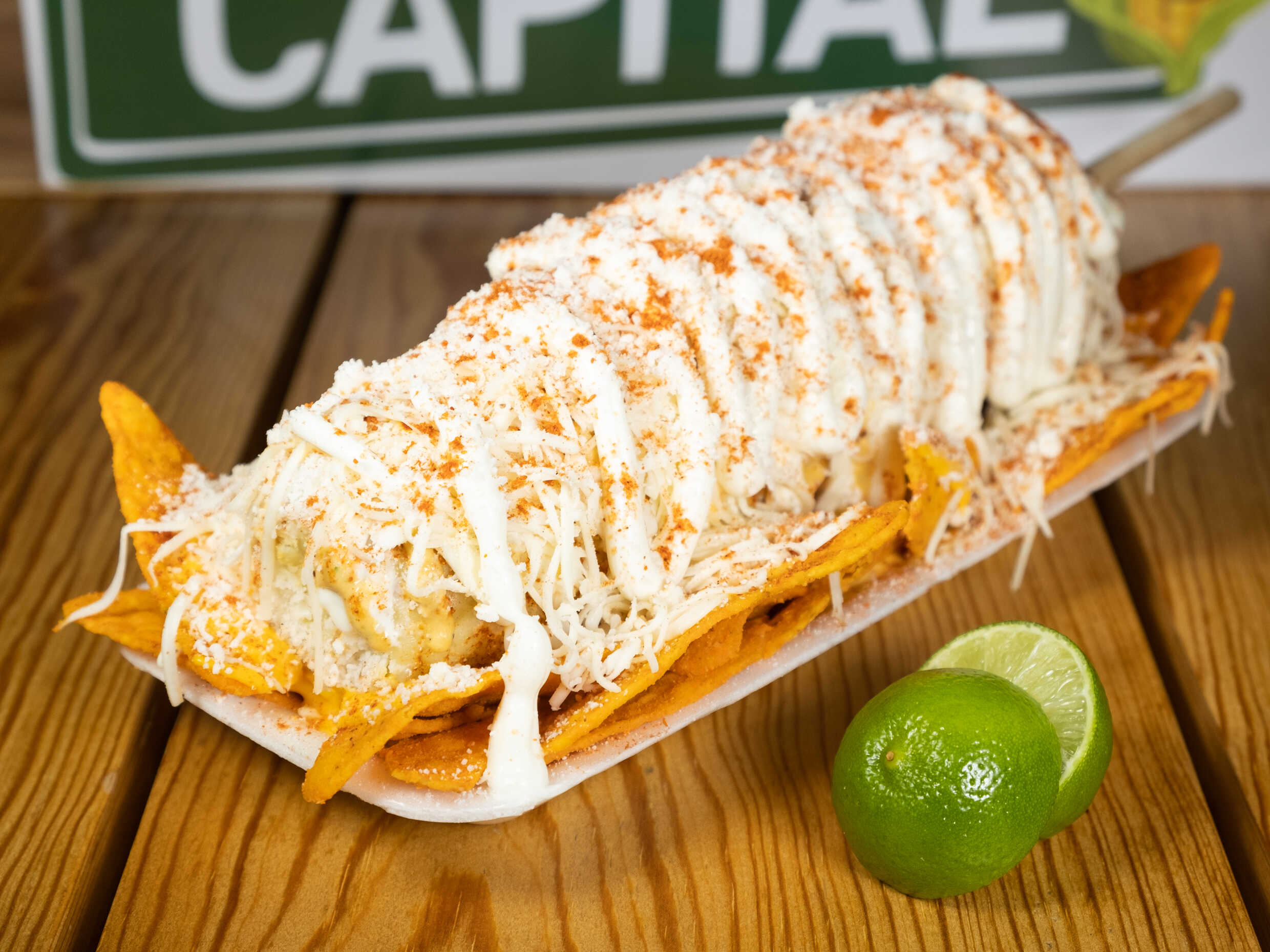 Elote Entero Preparado En Una Charola Con Doritos Alrededor.