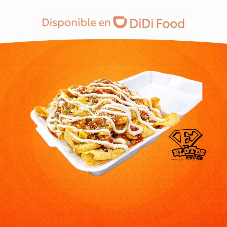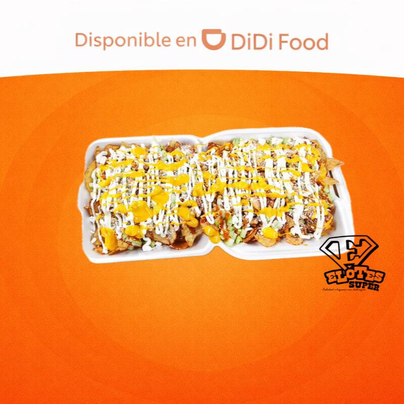 Nachos, queso amarillo, elote, queso blanco, crema y chile curtido.