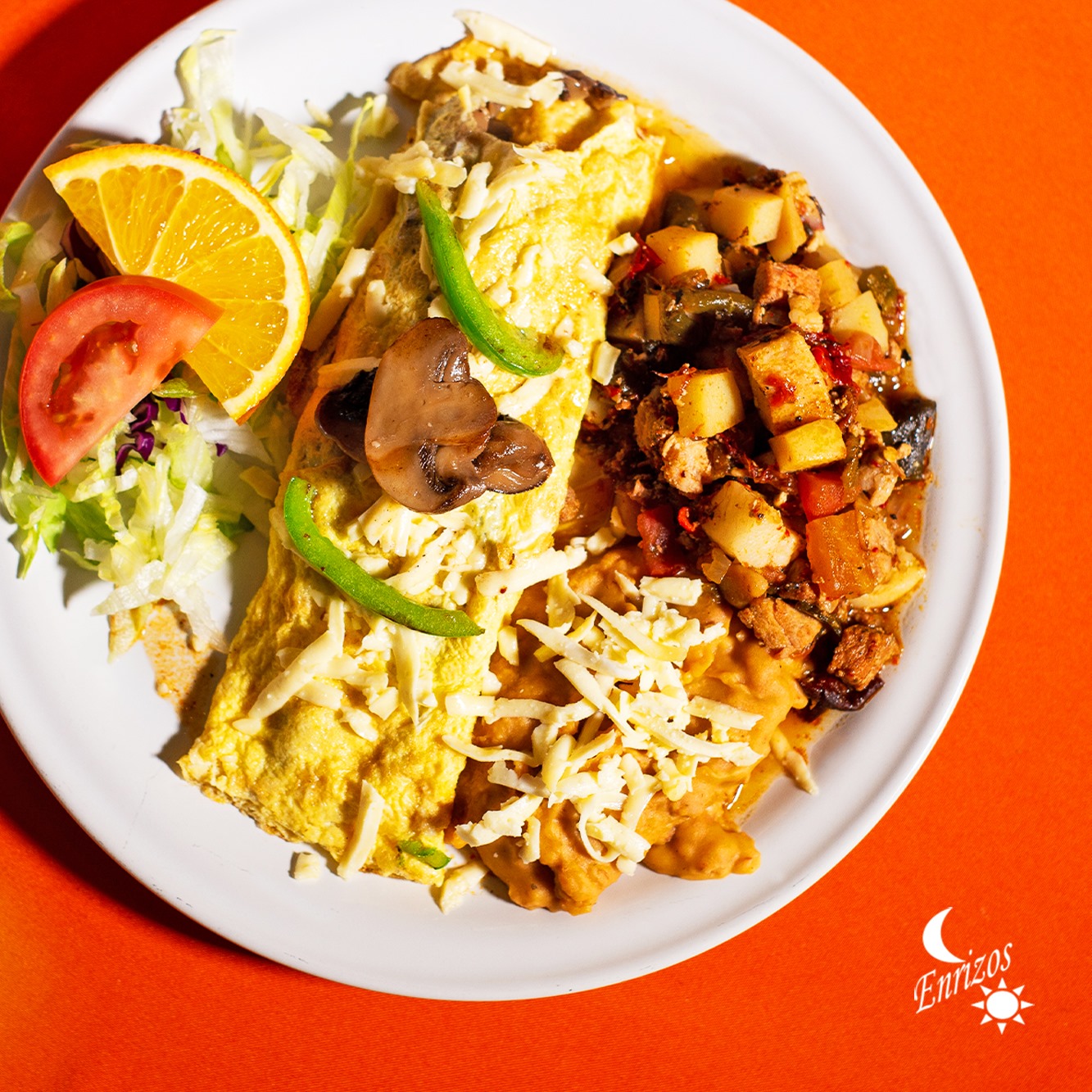 Omelet relleno de champiñones, pimientos verdes y queso Chihuahua, se acompaña de frijoles refritos, ensalada y chilaquiles o guisado a escoger