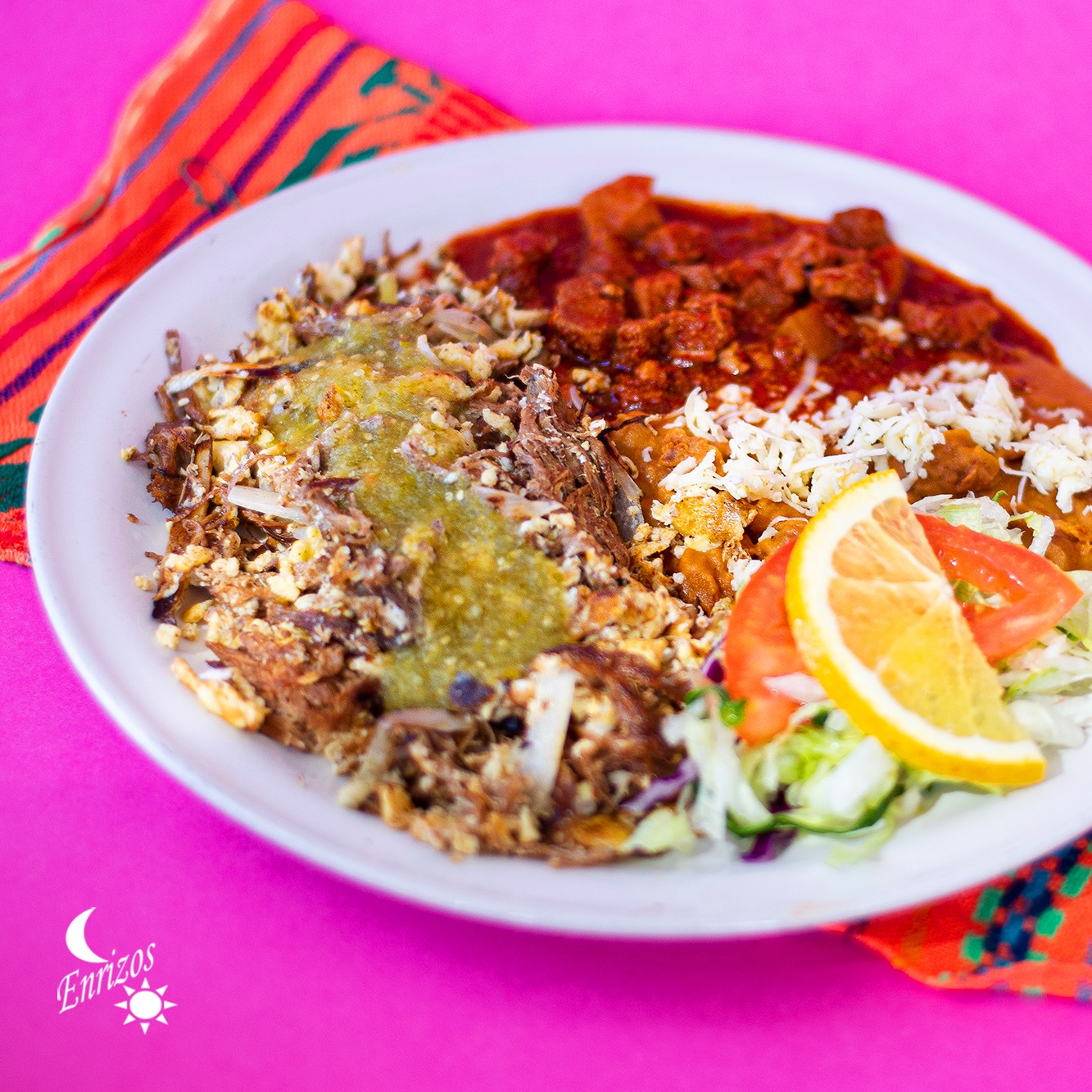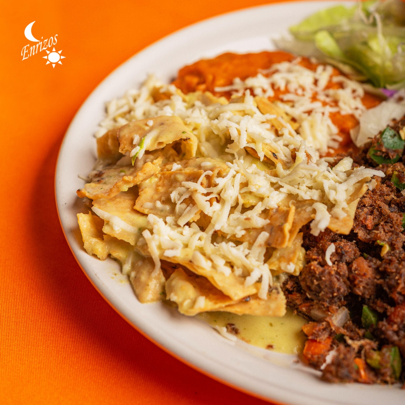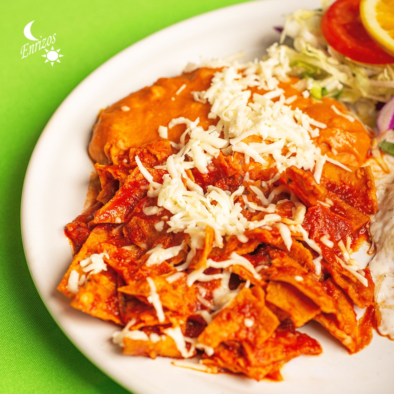 Totopos ahogados en deliciosa salsa roja y cubiertos de queso, se acompañan de frijoles refritos, ensalada y guisado a escoger