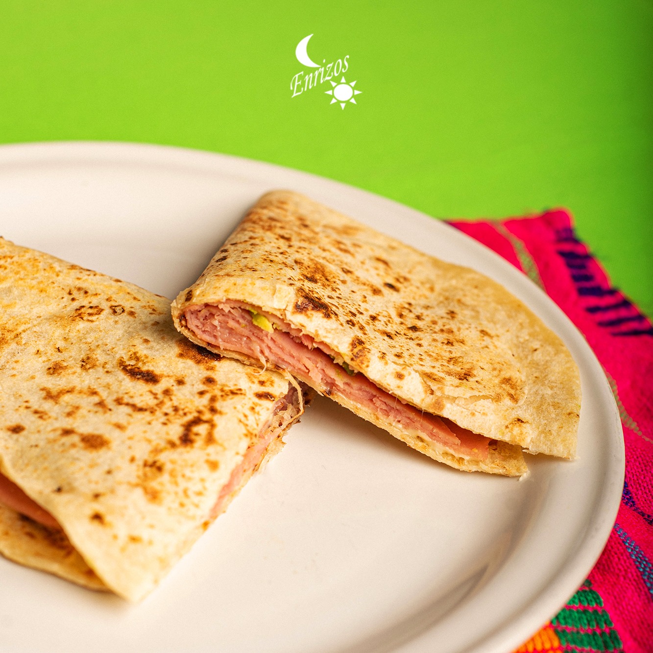 Tortilla de harina o maíz recién echas, jamón, asadero y aguacate