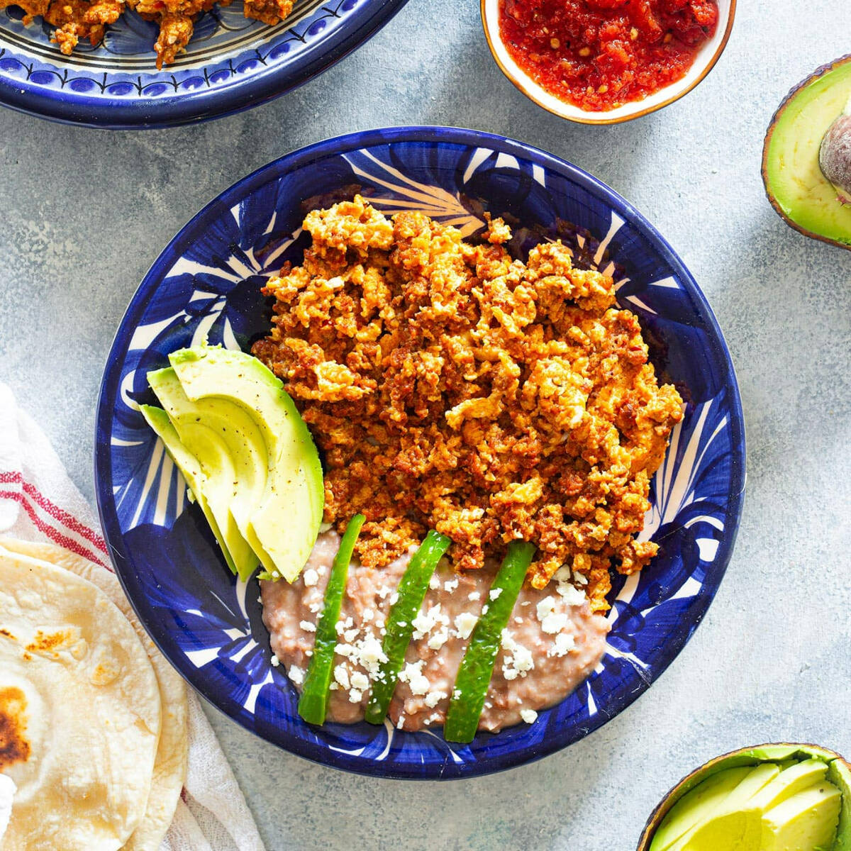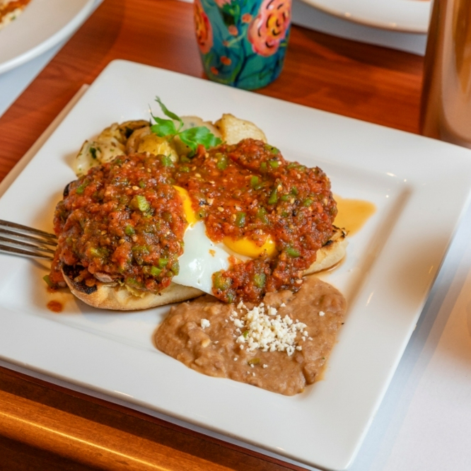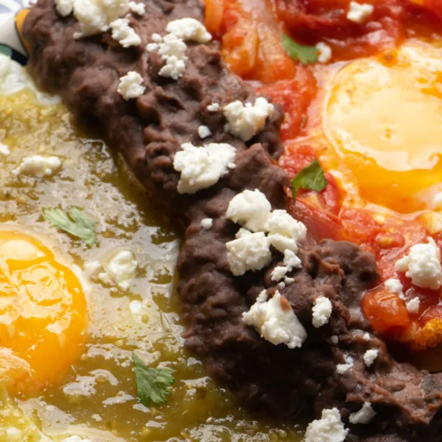 Servidos sobre tortilla bañados en salsa y nuestros deliciosos frijolitos