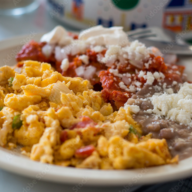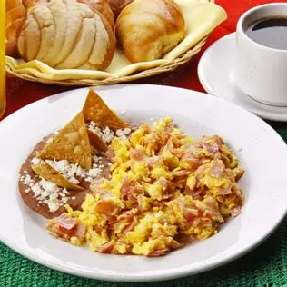 Huevos revueltos acompañados de chilaquiles en salsa casera, ya sea roja o verde,con frijoles refritos y tortillas.