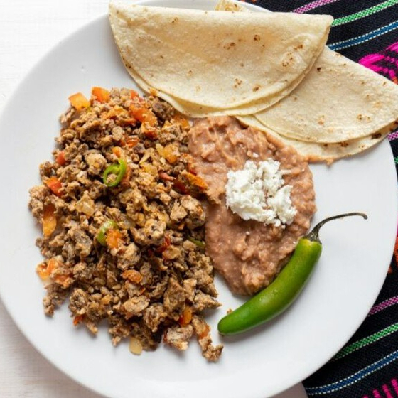 deliciosa y tradicional machaca, preparada con cebolla acompañada de nuestros delciciosos frijolitos